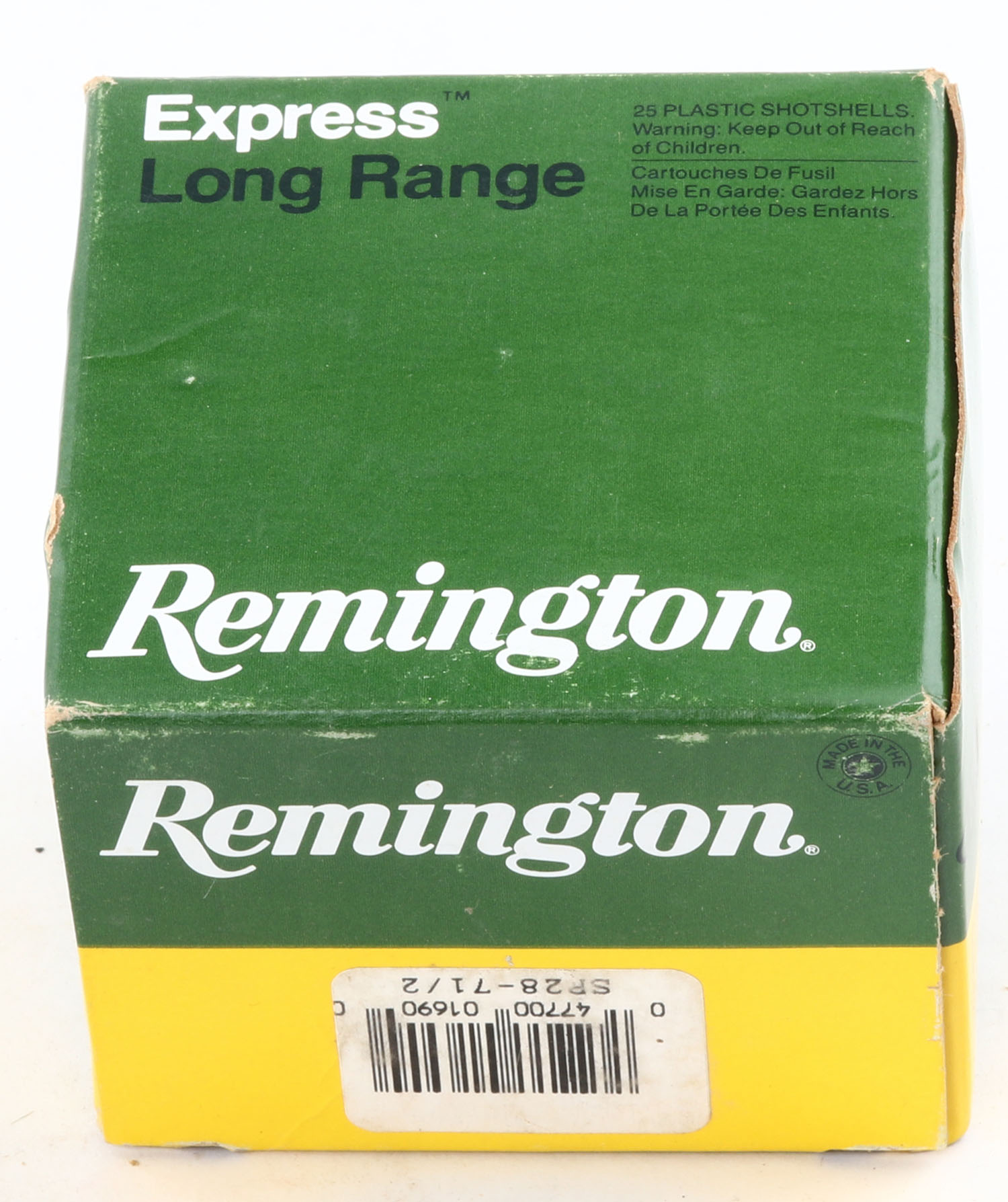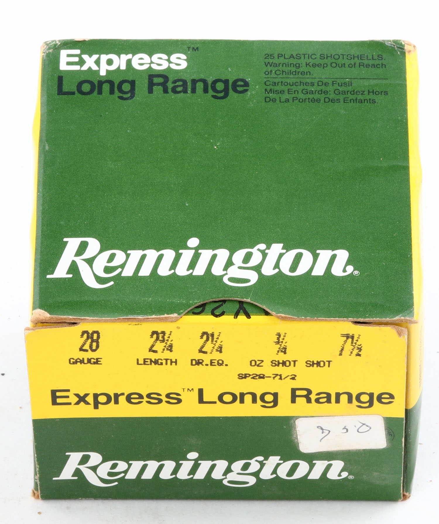 Remington, Express Long Range, 28ga., 1pc., Full, shot size 7 1/2, 2 3/4'', multi-colored box, plastic shells are excellent. Grade: Excellent ++ - Value: 16 to 40