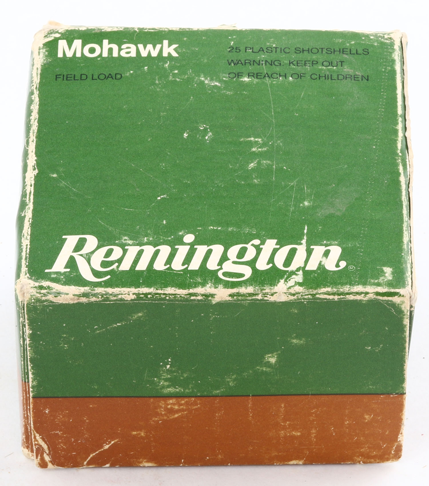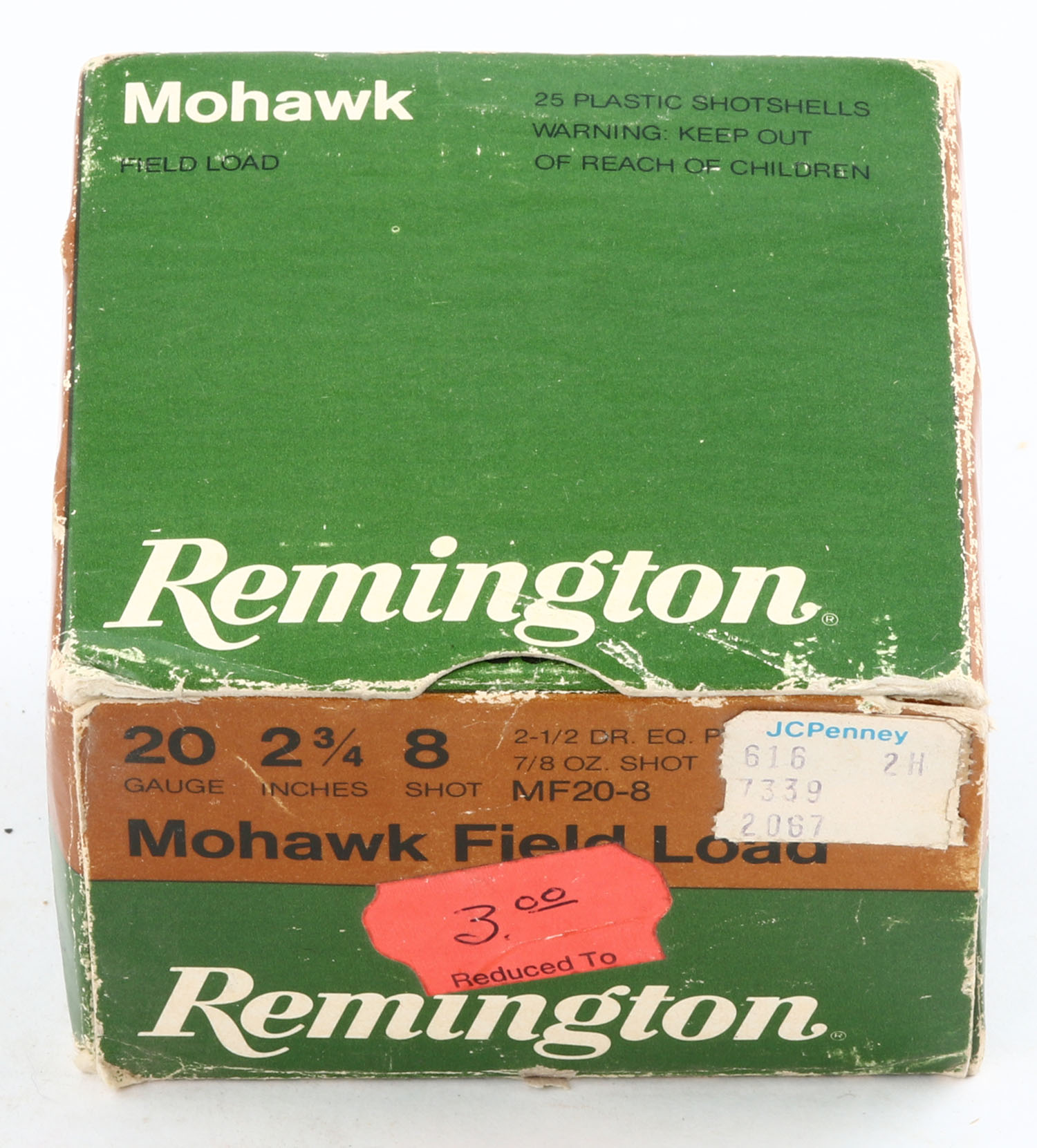 Remington, Mohawk Field Load, 20ga., 1pc., Full, shot size 8, multi-colored box, has edge wear, plastic shells are very good. Grade: Good ++ - Value: 10 to 20