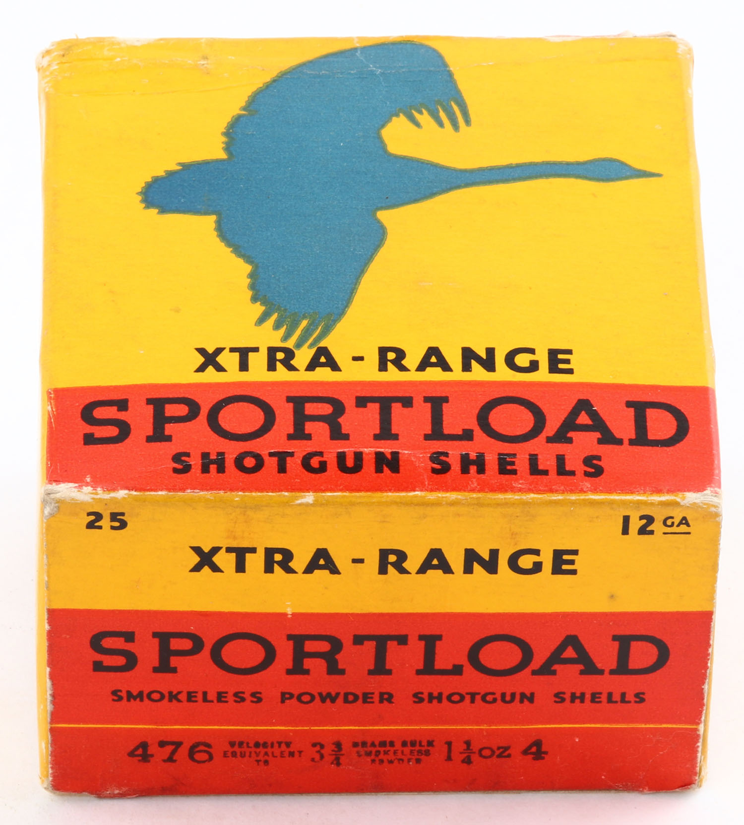 Sears Sportload, XTRA-RANGE, 12ga., 1pc., Empty, shot size 4, buff box with yellow, blue & red label that pictures a Goose in flight, box has some scuffing with excellent colors. Grade: Excellent - Value: 10 to 40
