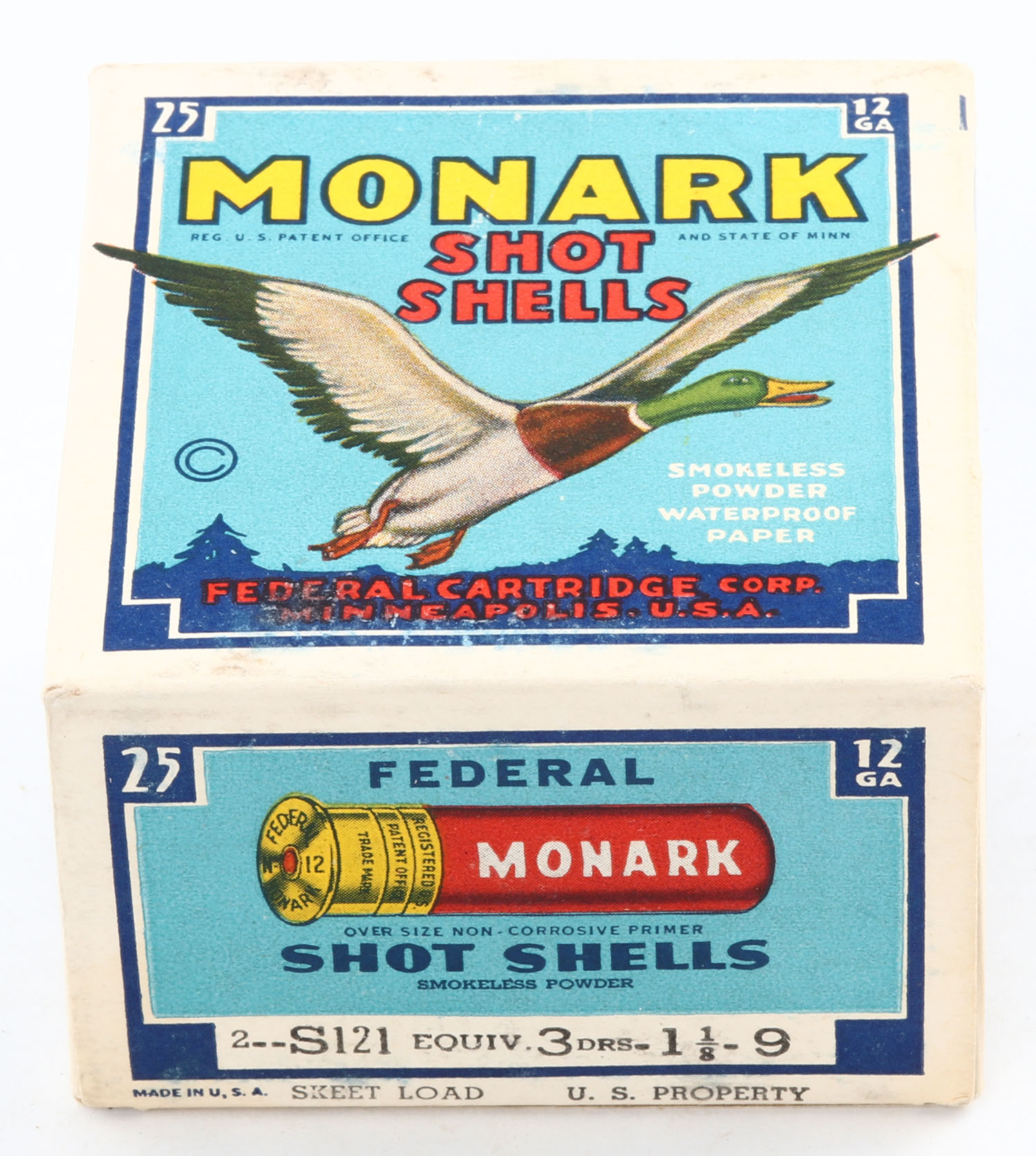 Federal Cart. Co., MONARK, U.S. Property, 12ga., 1pc., Empty, shot size 9 Skeet Load, Blue border, black, yellow and red box with flying mallard, box is very solid with excellent colors. Grade: Excellent ++ - Value: 10 to 60