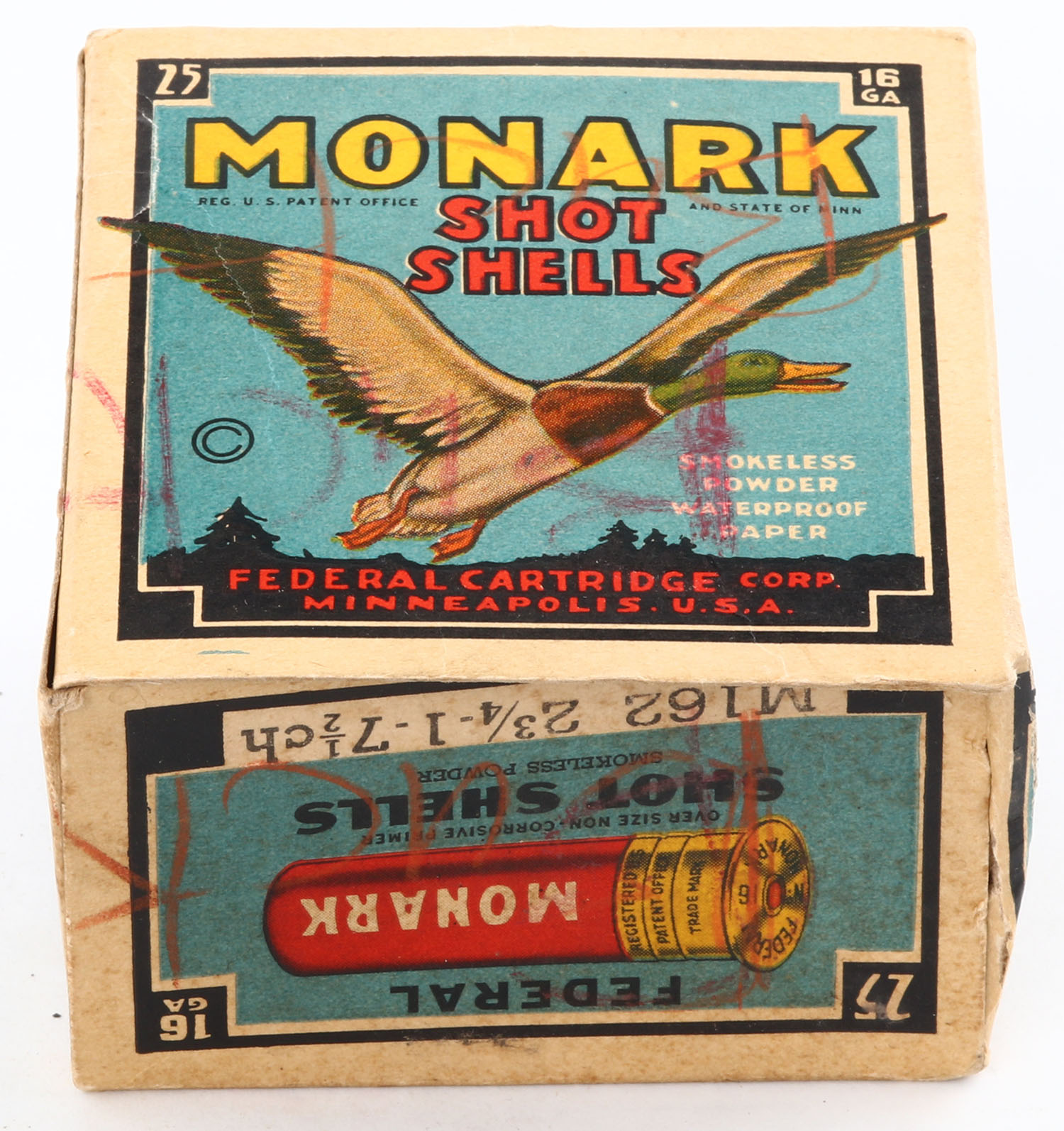 Federal Cart. Co., MONARK, 16ga., 1pc., Empty, shot size 7 1/2CH, Black border, blue, yellow and red box with flying mallard, box has light age soiling with pen marks. Grade: Very Good + - Value: 8 to 30