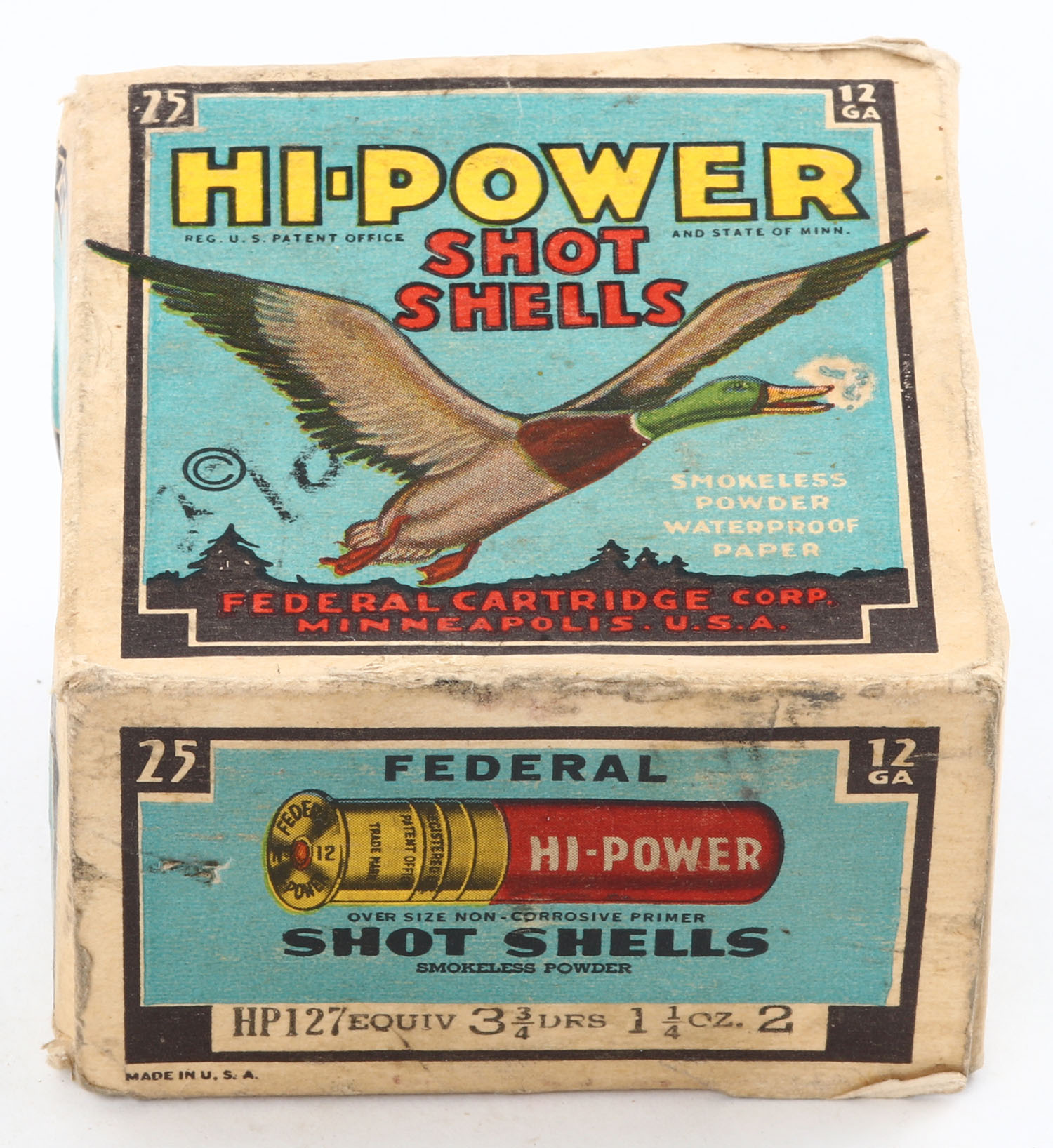 Federal Cart. Co., HI-POWER, 12ga., 1pc., Partial 18rds, shot size 2, Black border, blue, yellow and red box with flying mallard, box has age soiling with edge wear & scuffing, paper shells are excellent. Grade: Good - Value: 10 to 20