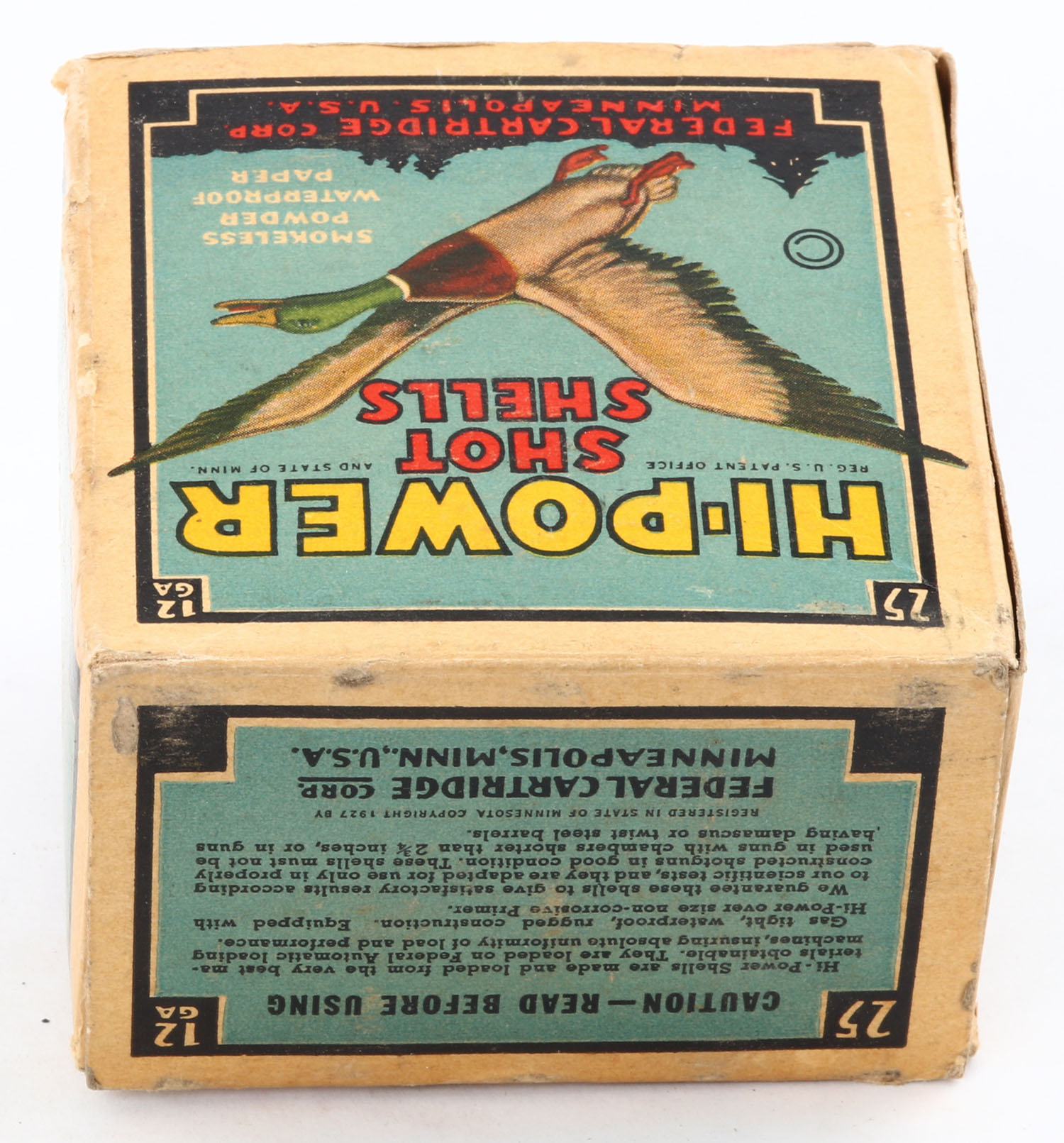 Federal Cart. Co., HI-POWER, 12ga., 1pc., Partial 11 Rds., shot size 4 CH, Black border, blue, yellow and red box with flying mallard, box has soiling with a partial seam split, light edge wear with very nice colors, paper shells are very good. Grade: Very Good - Value: 10 to 20