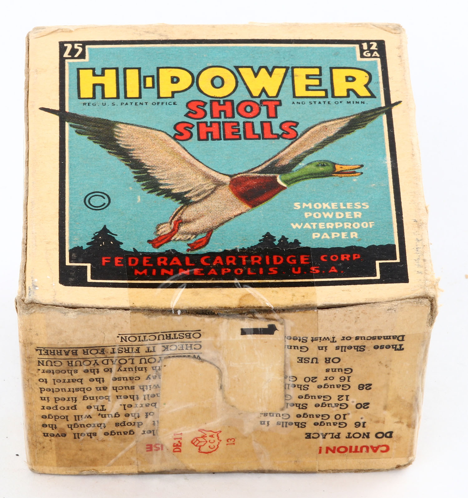 Federal Cart. Co., HI-POWER, 12ga., 1pc., Full, shot size 6, Black border, blue, yellow and red box with flying mallard, box has light age soiling with edge wear, box is missing bottom flap, paper shells are very good. Grade: Very Good - Value: 10 to 40