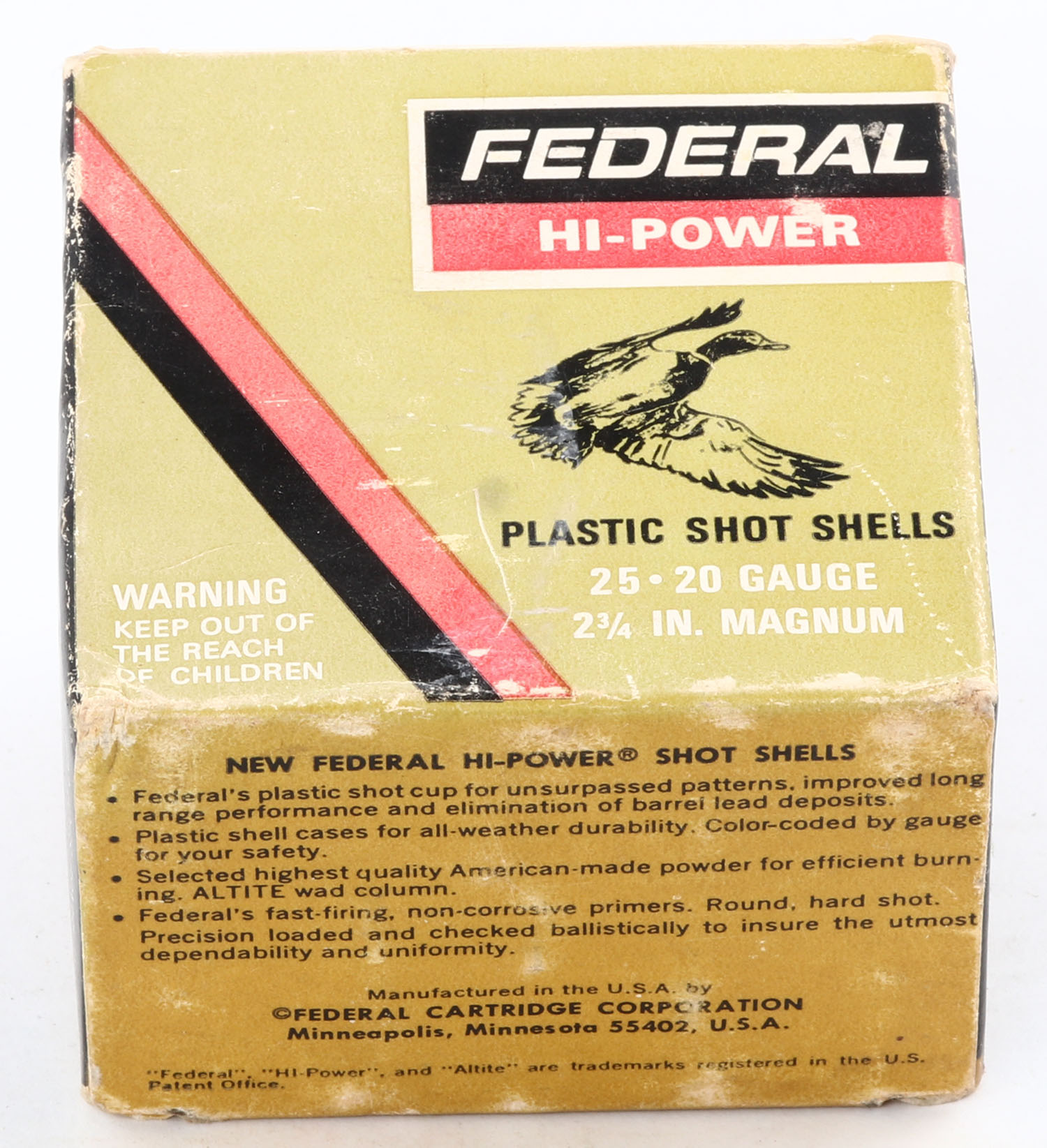 Federal, Hi-Power, 20ga., 2 3/4'', 1pc., Full, shot size 4 Magnum Load, multi-colored box, box is solid, plastic shells are good. Grade: Very Good ++ - Value: 10 to 40