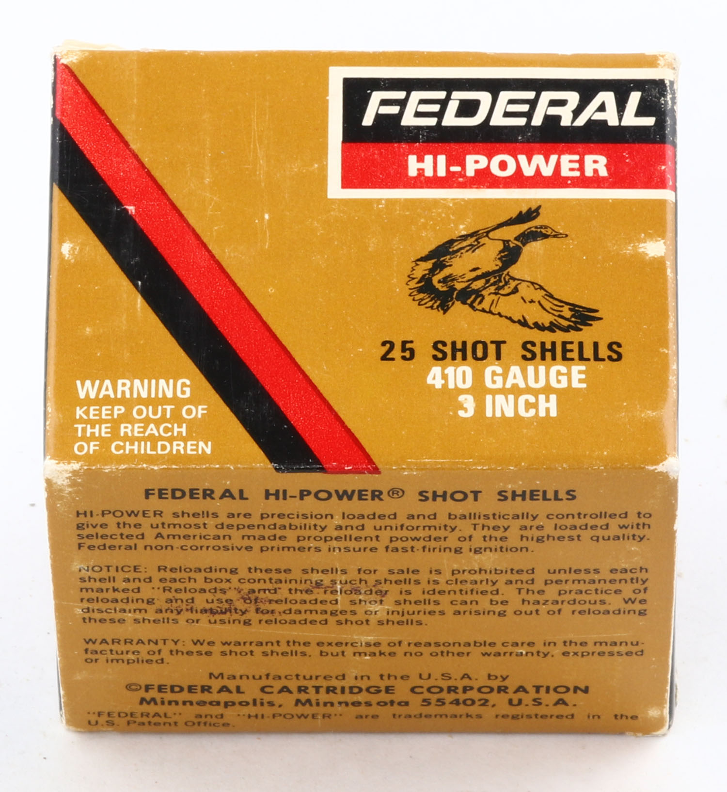 Federal, Hi-Power, 410ga., 1pc., Full, 3'', shot size 6, box is solid with great colors, paper shells are excellent. Grade: Excellent - Value: 10 to 30