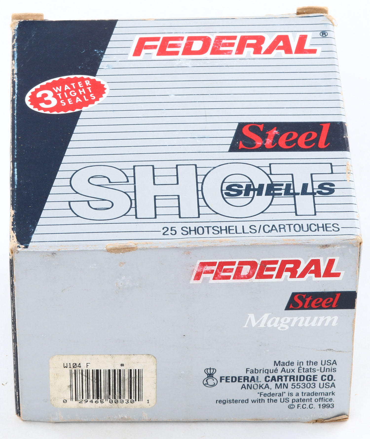 Federal, Steel Magnum, 10ga., 1pc., Partial 22rds, shot size F, 3 1/2'', multi-colored box, box is solid, plastic shells are excellent. Grade: Excellent - Value: 20 to 50