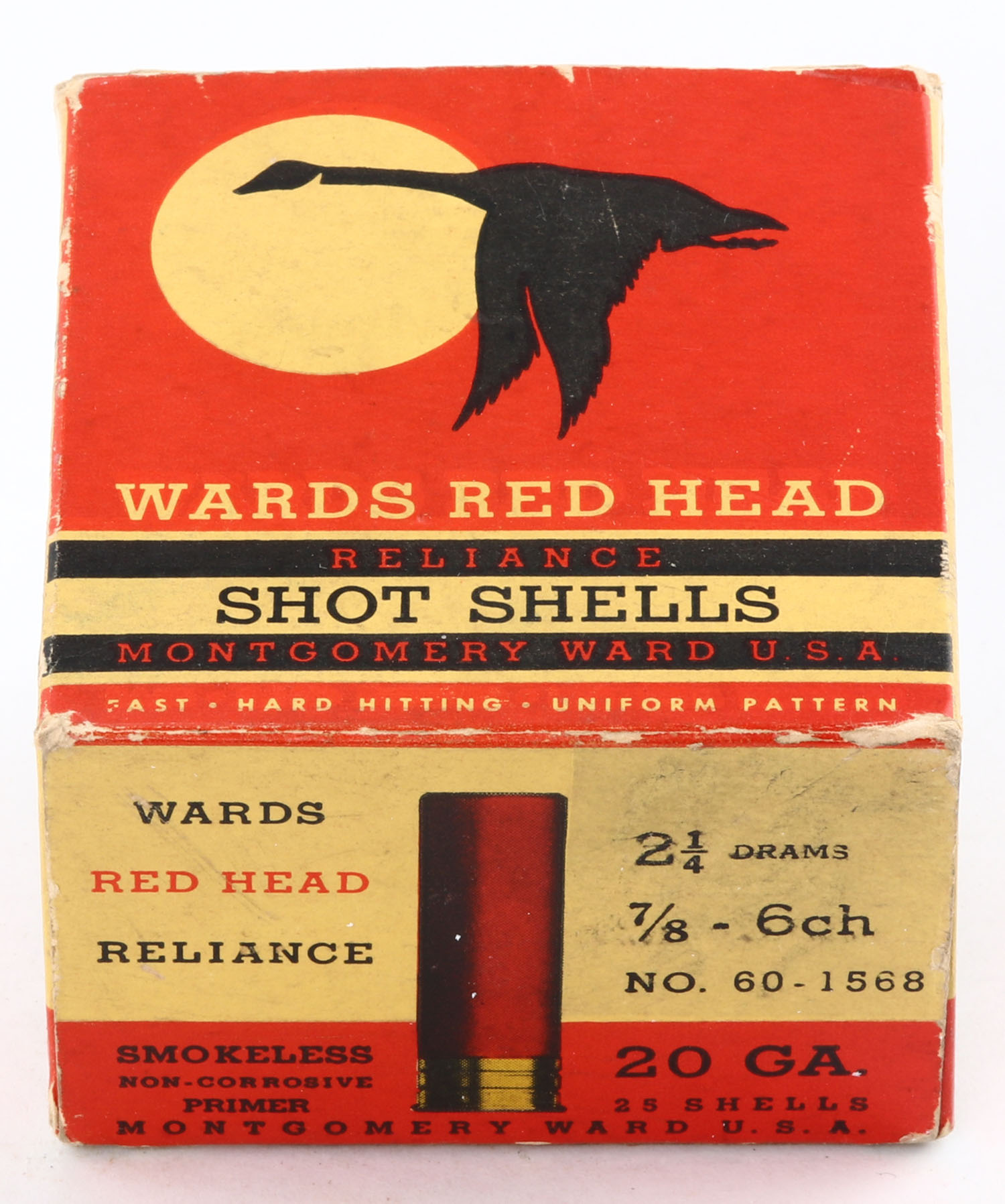 Montgomery Ward & Co., Red Head Reliance, 20ga., 1pc., Empty, shot size 6ch, red background with black goose flying through the moon, box has light scuffing with great colors. Grade: Very Good ++ - Value: 10 to 40
