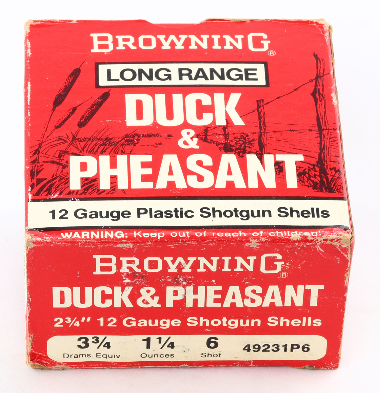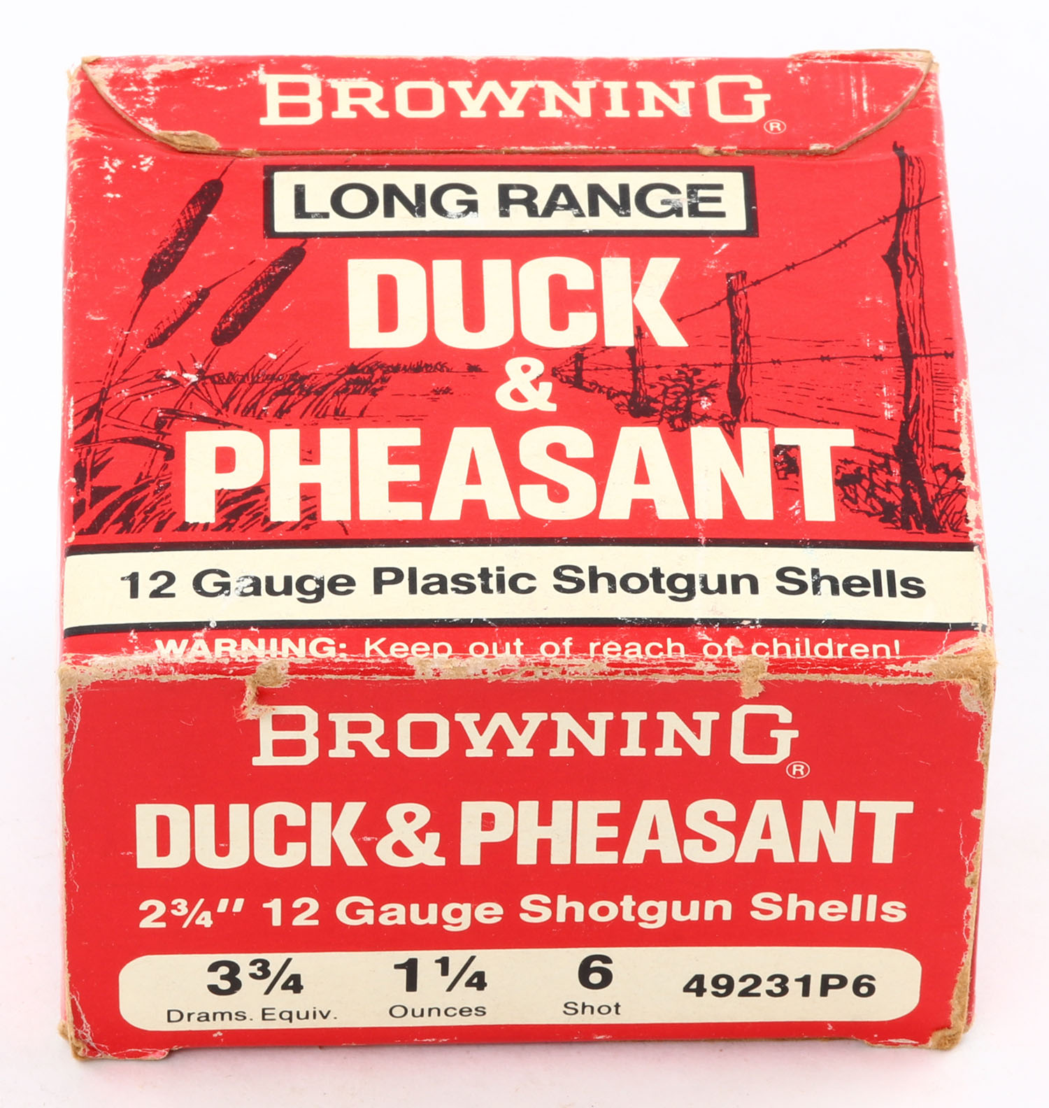 Browning, Duck & Pheasant, 12ga., 1pc., Full, shot size 6, 2 3/4'', multi-colored box, box has light scuffing & corner wear with great color, plastic shells are excellent. Grade: Very Good ++ - Value: 20 to 50