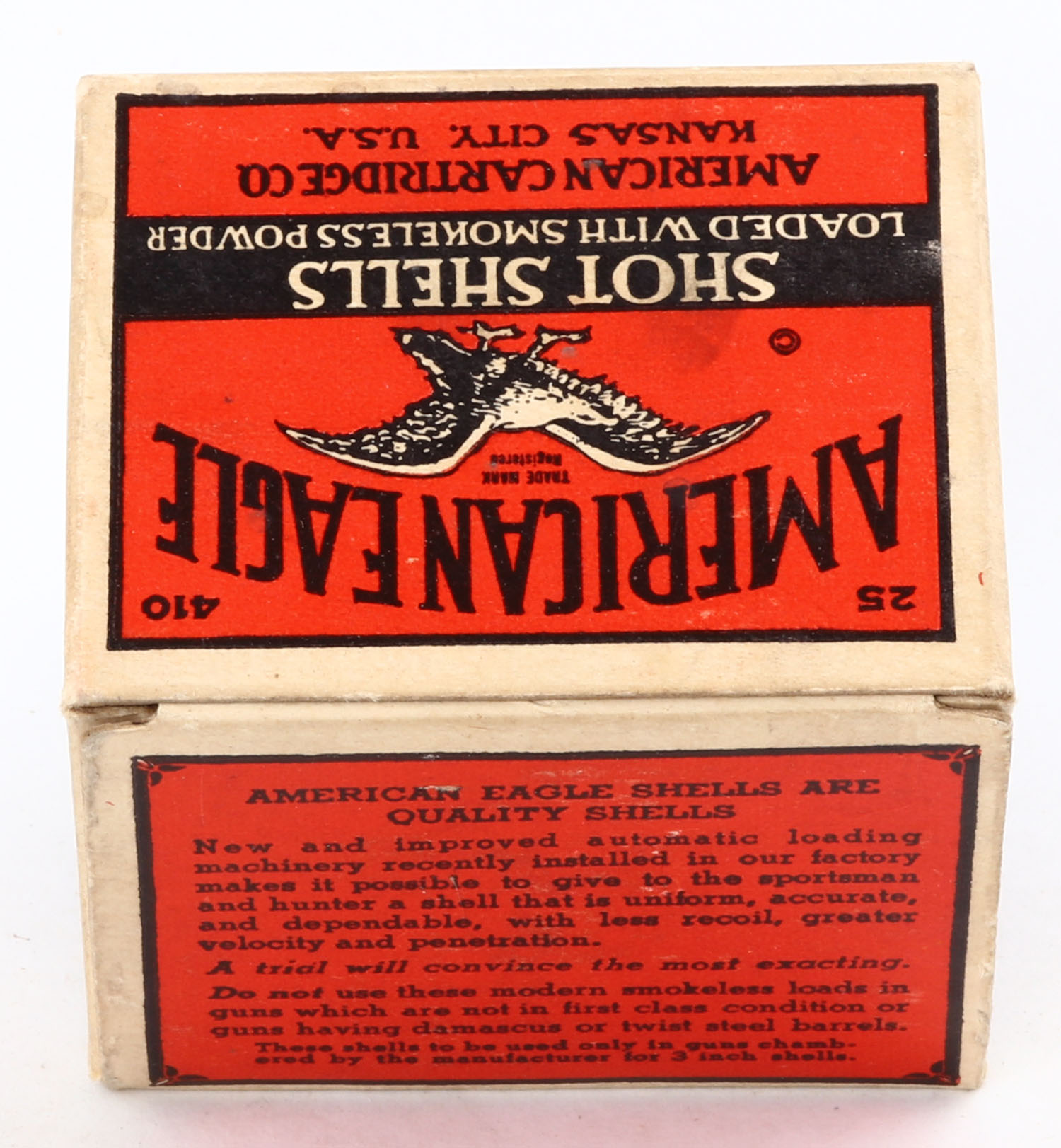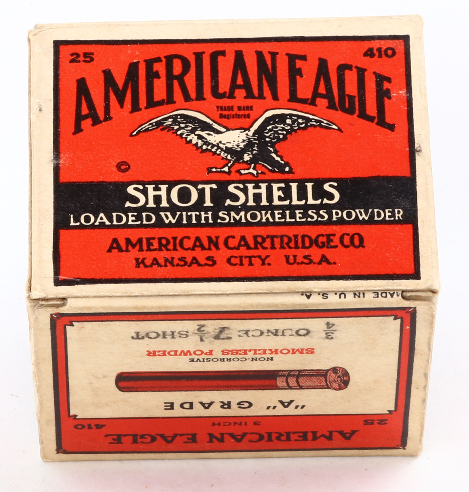 American Cart., Co., ''A'' Grade, 410ga., 1pc., Full., shot size 7 1/2, buff, red & black box that pictures a flying eagle, box is very solid with excellent colors, paper shells are excellent. Grade: Excellent ++ - Value: 100 to 200
