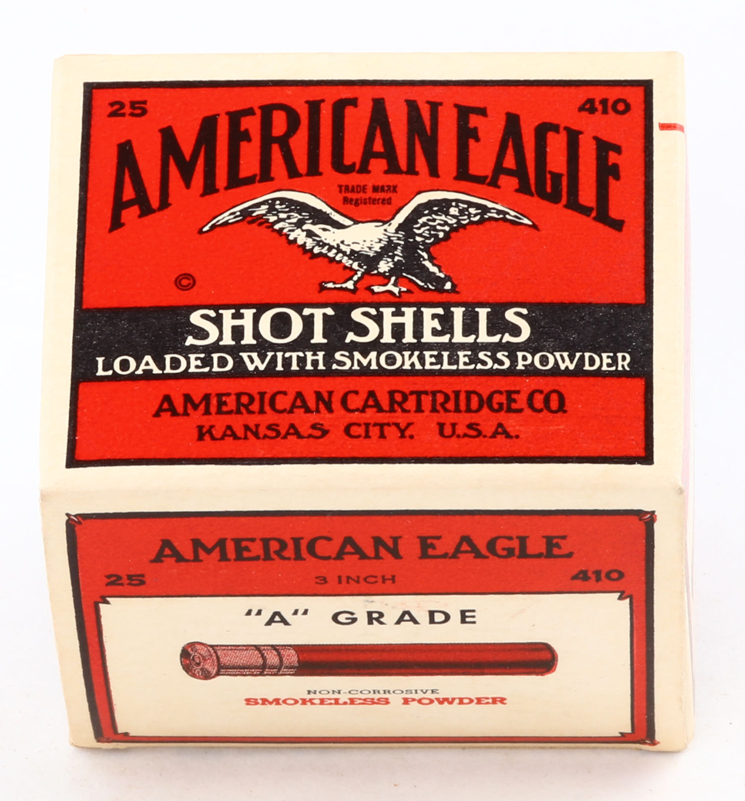 American Cart., Co., ''A'' Grade, 410ga., 1pc., Empty, buff, red & black box that pictures a flying eagle, box is very solid with excellent colors. Grade: MINT - Value: 40 to 200