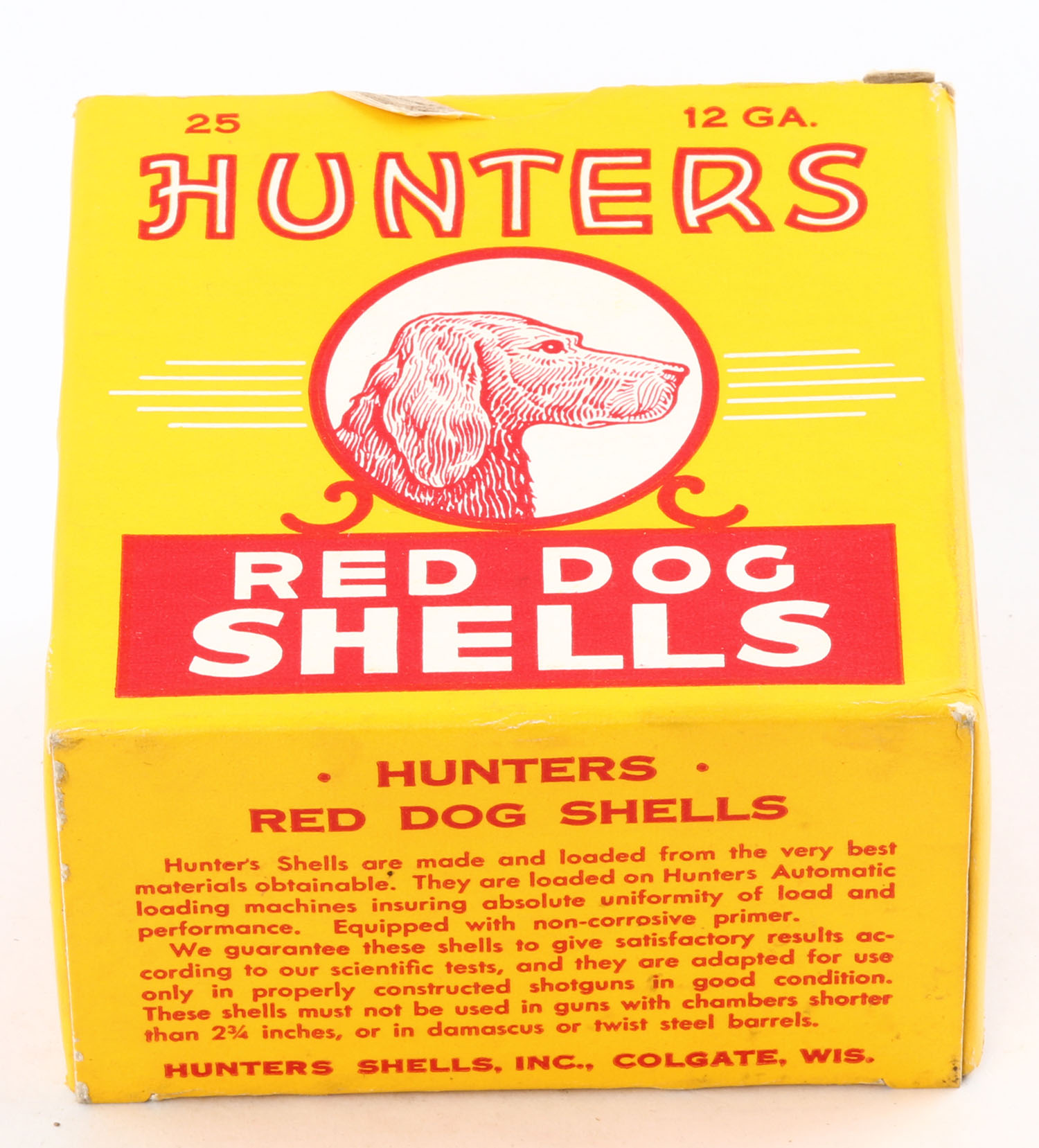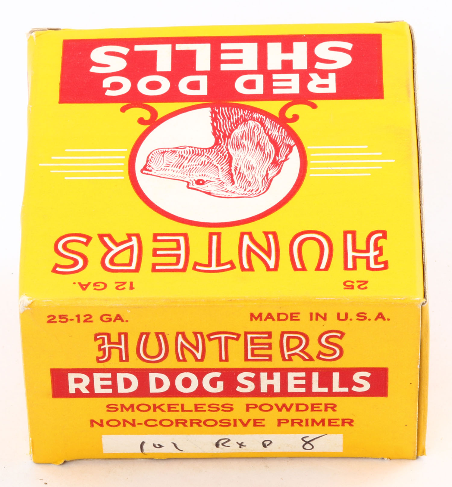 Hunters, Red Dog Shells, 12ga., 1pc., Full, 2 1/4'', shot size 8, H/S: REM-UMC SHUR SHOT No.12, multi-colored box, box is very solid, plastic shells are excellent. Grade: Excellent ++ - Value: 10 to 40