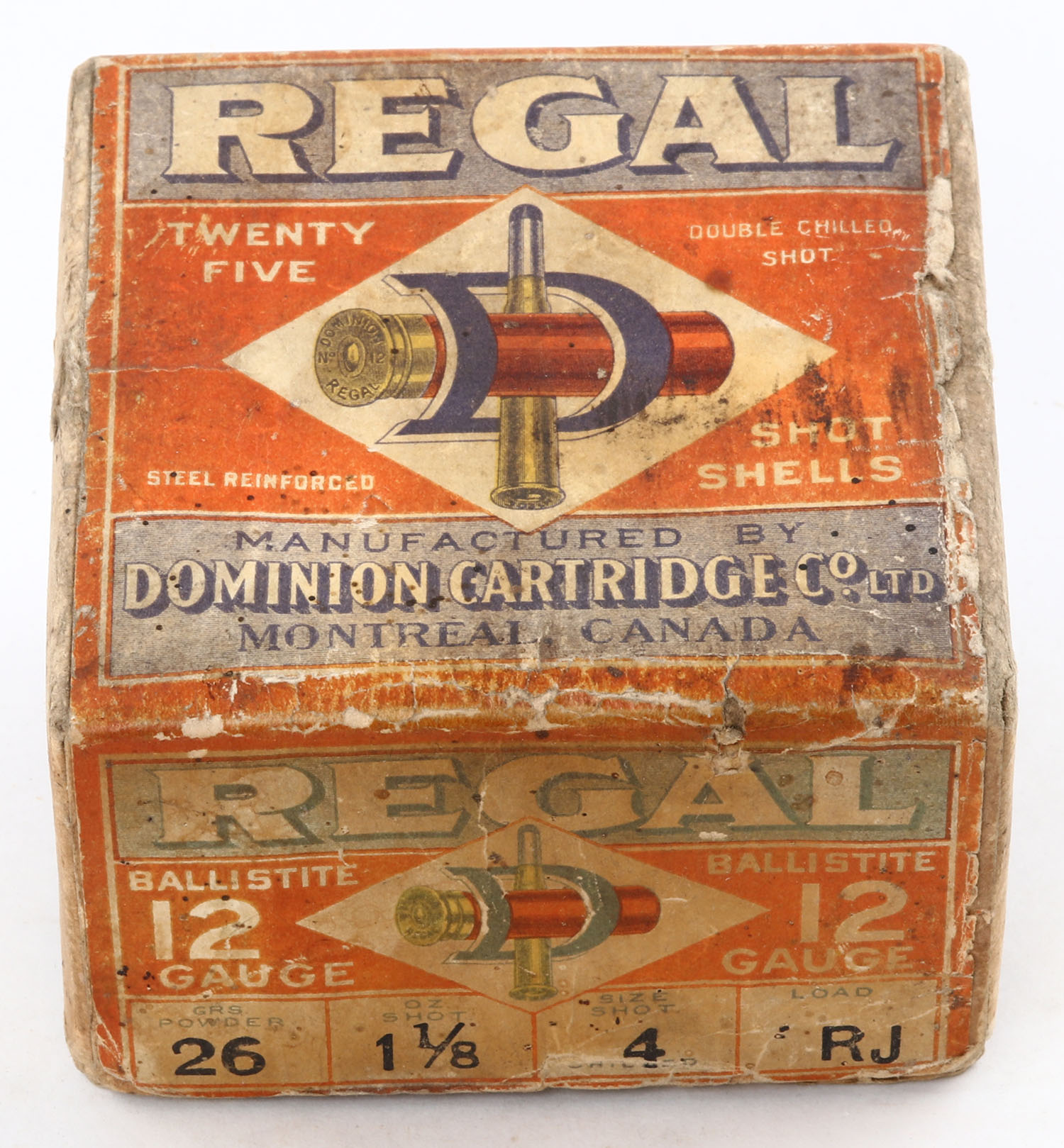RARE Dominion Cartridge Co., REGAL, 12ga., 2pc., Empty, shot size 4CH, has early Bent D Logo, box has soiling & scuffing with edge wear. Grade: Good ++ - Value: 40 to 300