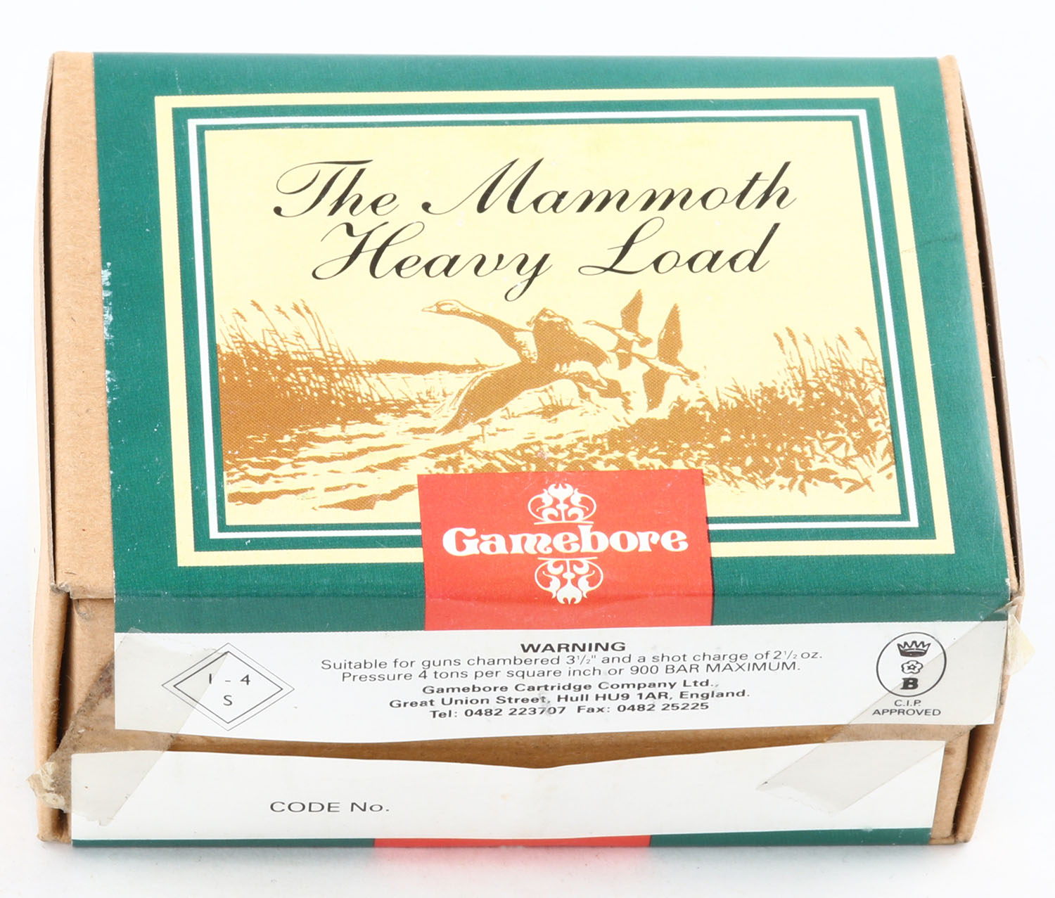 Gamebore, The Mammoth Heavy Load, 10ga., 1pc., Full & Sealed, shot size 5, multi-colored box, box is very solid. Grade: Excellent ++ - Value: 20 to 50