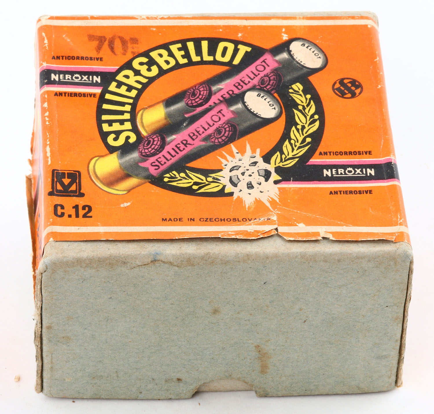 Sellier & Bellot, 12ga., 2pc., Empty, shot size 6, multi-colored box, box has scuffing & minor age soiling with very nice colors. Grade: Very Good ++ - Value: 20 to 60