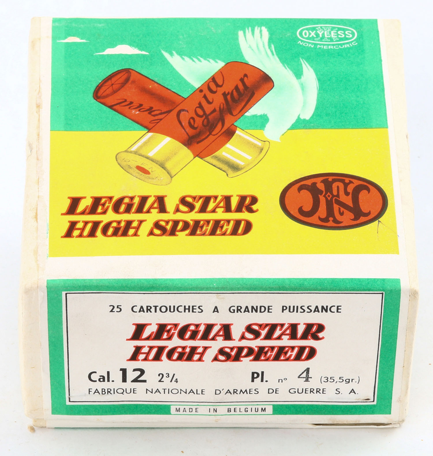 Legia Star, High Speed, 12ga., 2pc., Empty has Insert, 2 3/4'', shot size 4, white box with multi-colored label, box and label are very solid, Made in Belgium. Grade: Excellent ++ - Value: 20 to 200