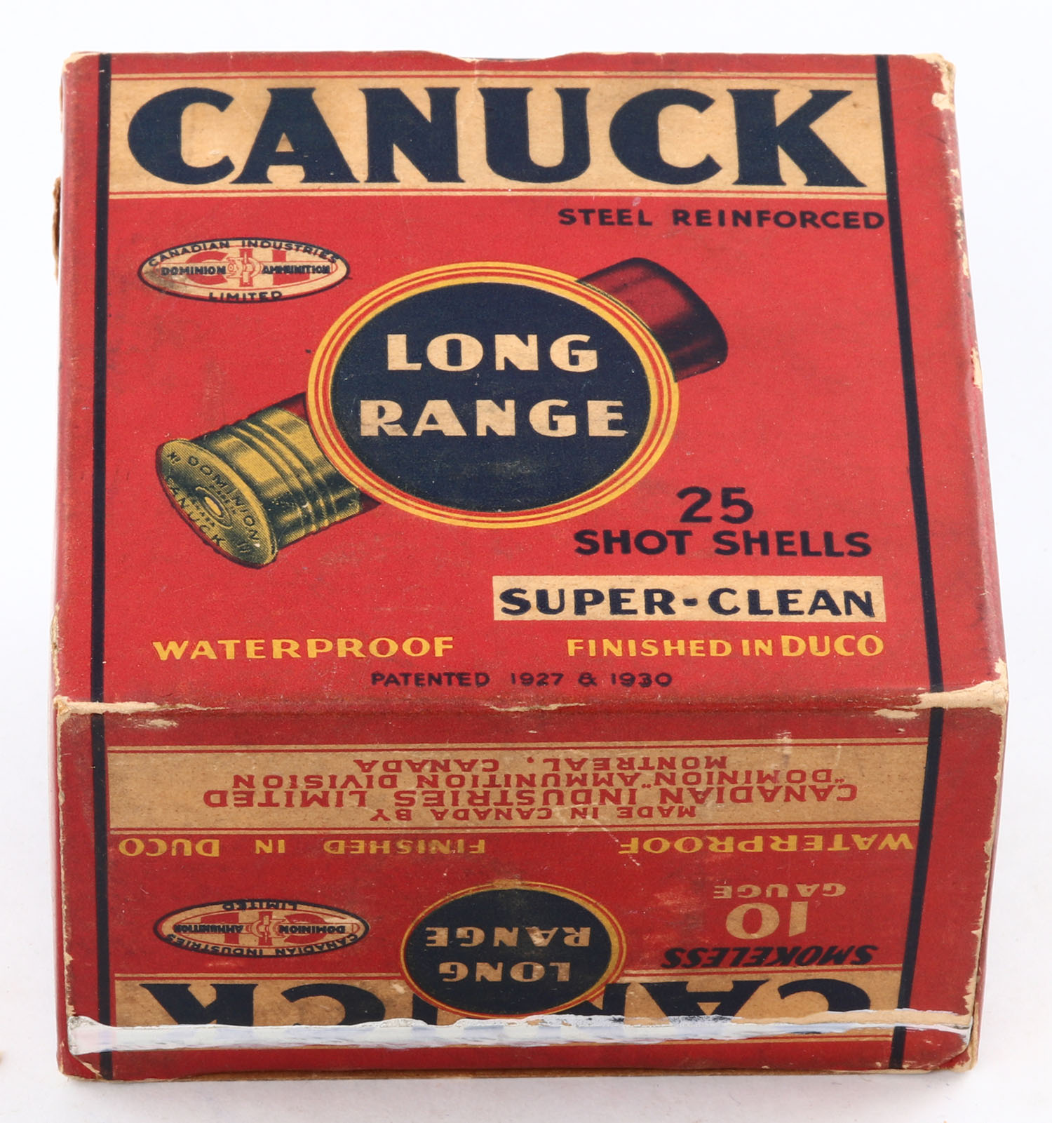 CIL, Canuck, 10ga., 1pc., Empty, shot size 2CH., multi-colored box, box has light age soiling with light edge & corner wear, has a seam split to top flap. Grade: Very Good - Value: 10 to 40