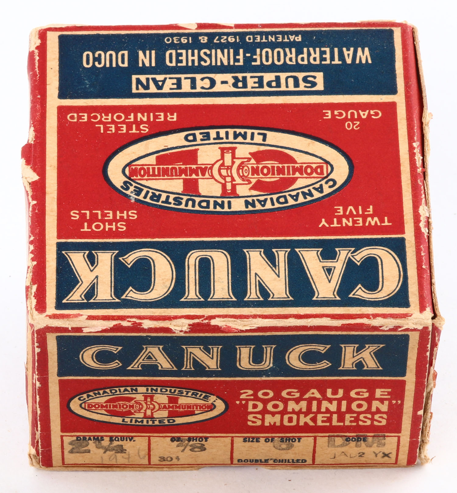 CIL, Canuck, 20ga., 1pc., Full, shot size 6CH, multi-colored box, box has edge wear with some shell protrusion, paper shells are excellent. Grade: Very Good + - Value: 10 to 40