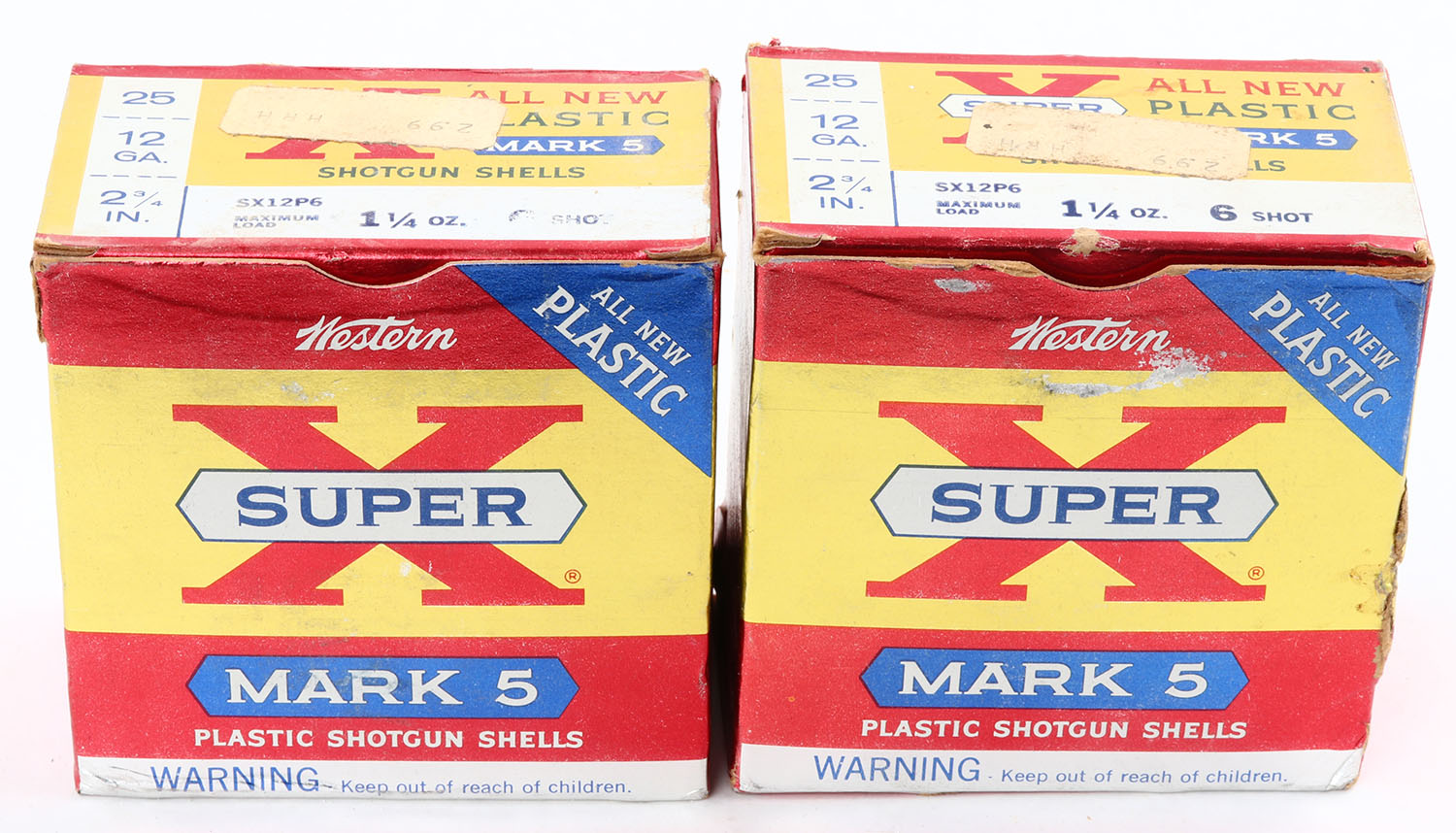 Lot of 2 Western, 12ga., 1pc., Appears Full, shot size 6, multi-colored box. Grade: Very Good ++ - Value: 10 to 40