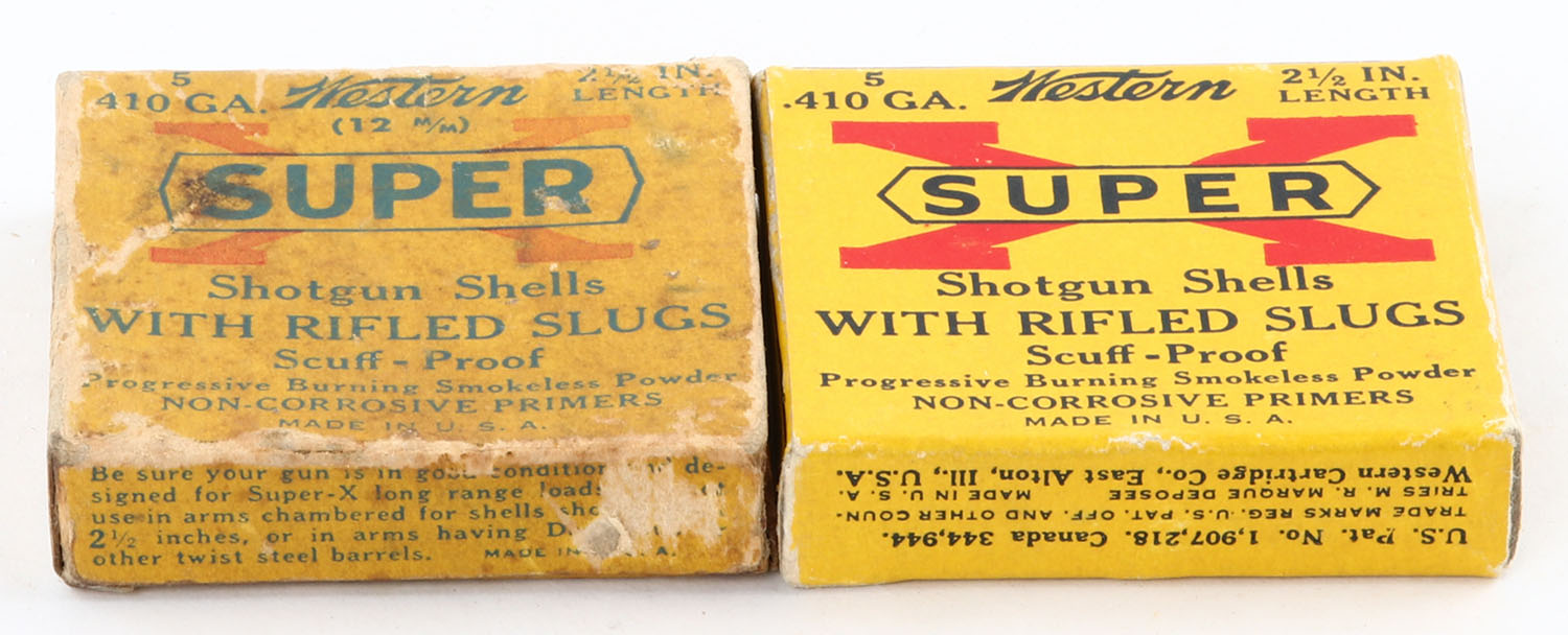 Lot of 2 Western, 410ga., 1pc., Appears Full, 2 1/2'', shot size Rifled Slugs, multi-colored boxes. Grade: Very Good - Value: 10 to 30