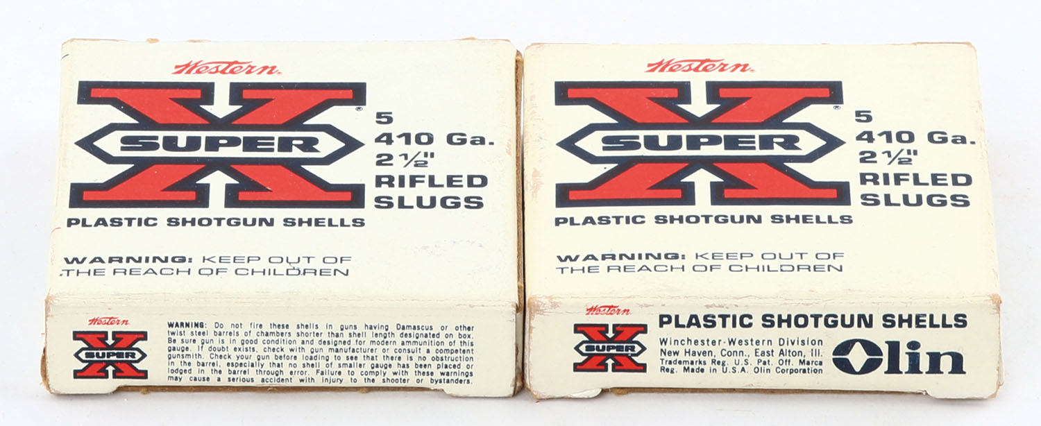 Lot of 2 Western, 410ga., 1pc., Appears Full, 2 1/2'', shot size Rifled Slugs, multi-colored boxes. Grade: Very Good - Value: 10 to 30