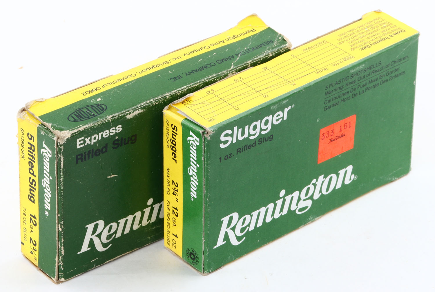 Lot of 2 Remington, 12ga., 1pc., shot size Rifled Slugs, Appears Full, multi-colored boxes. Grade: Very Good ++ - Value: 8 to 20