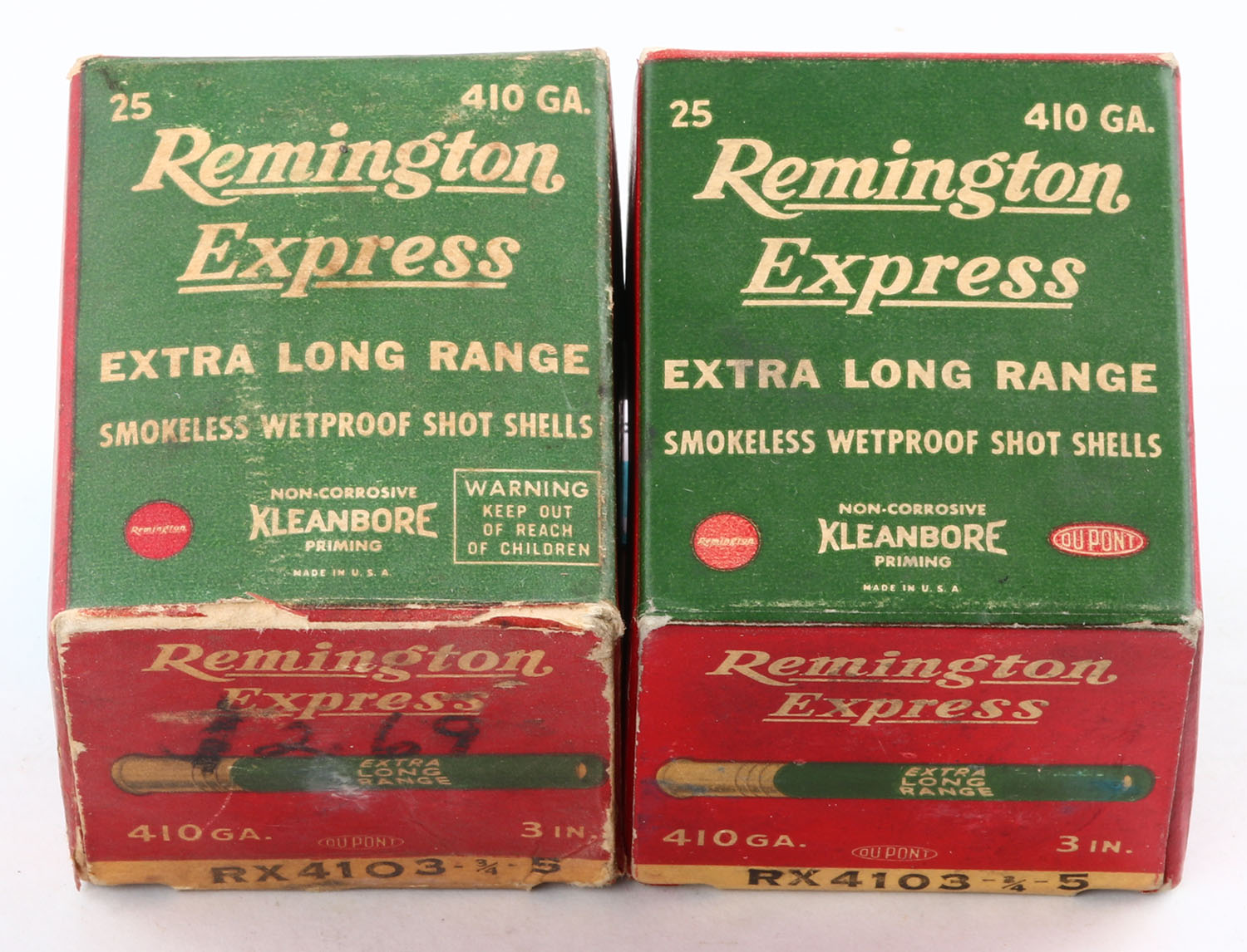 Lot of 2 Remington, Express, 410ga., 1pc., shot size 5, 3'', Appears Full, multi-colored boxes. Grade: Excellent - Value: 20 to 60