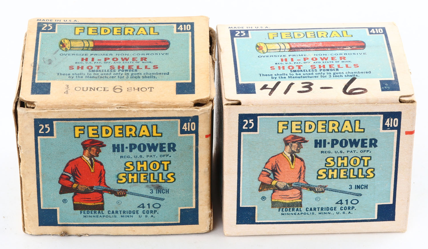 Lot of 2 Federal, Hi-Power, 410ga., 3'', 1pc., Appears Full, shot size 6, multi-colored boxes. Grade: Very Good - Value: 30 to 60