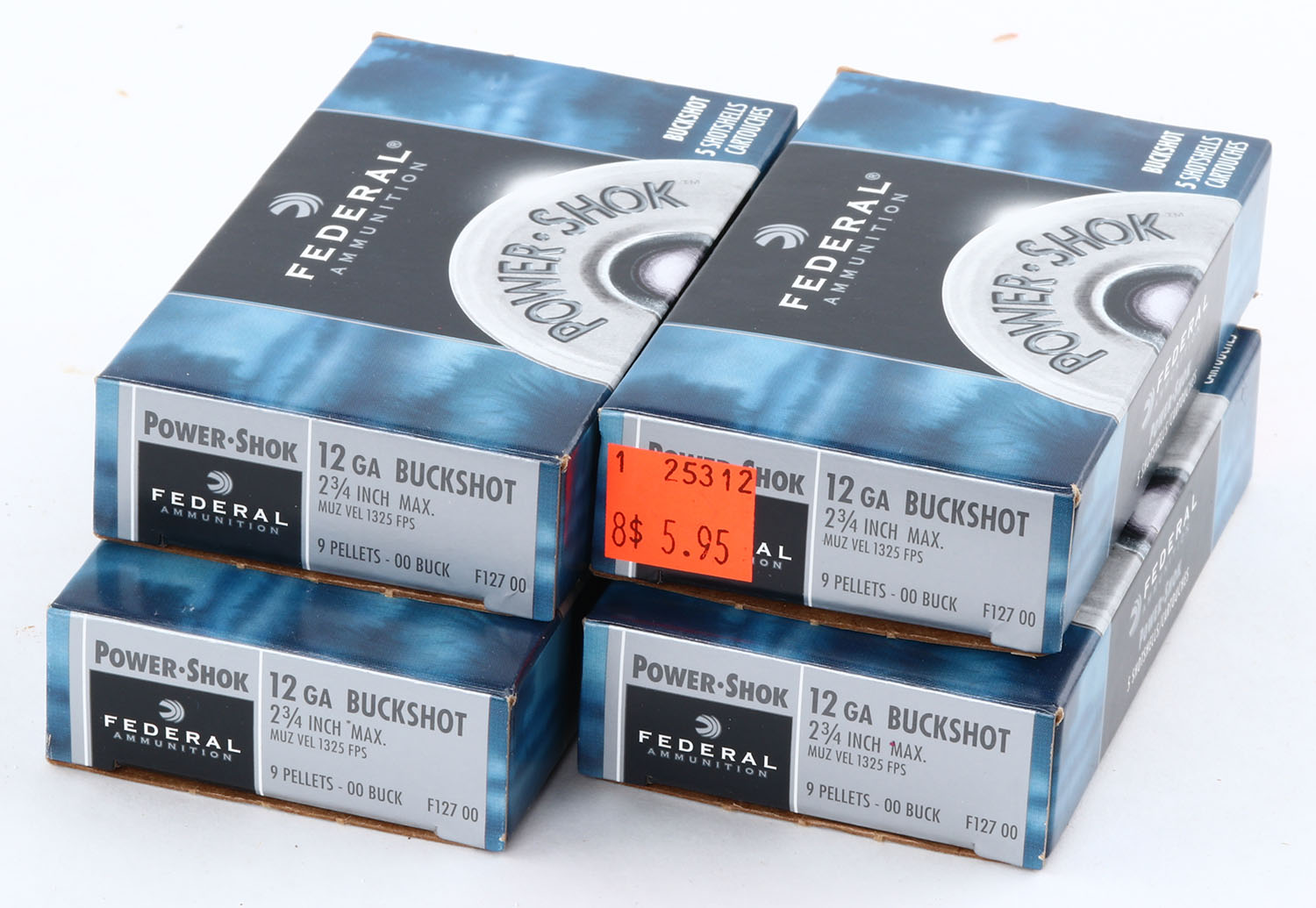 Lot of 4 Federal, 12ga., Appears Full, 2 3/4'', shot size 00 BUCK, multi-colored boxes. Grade: Excellent - Value: 10 to 30