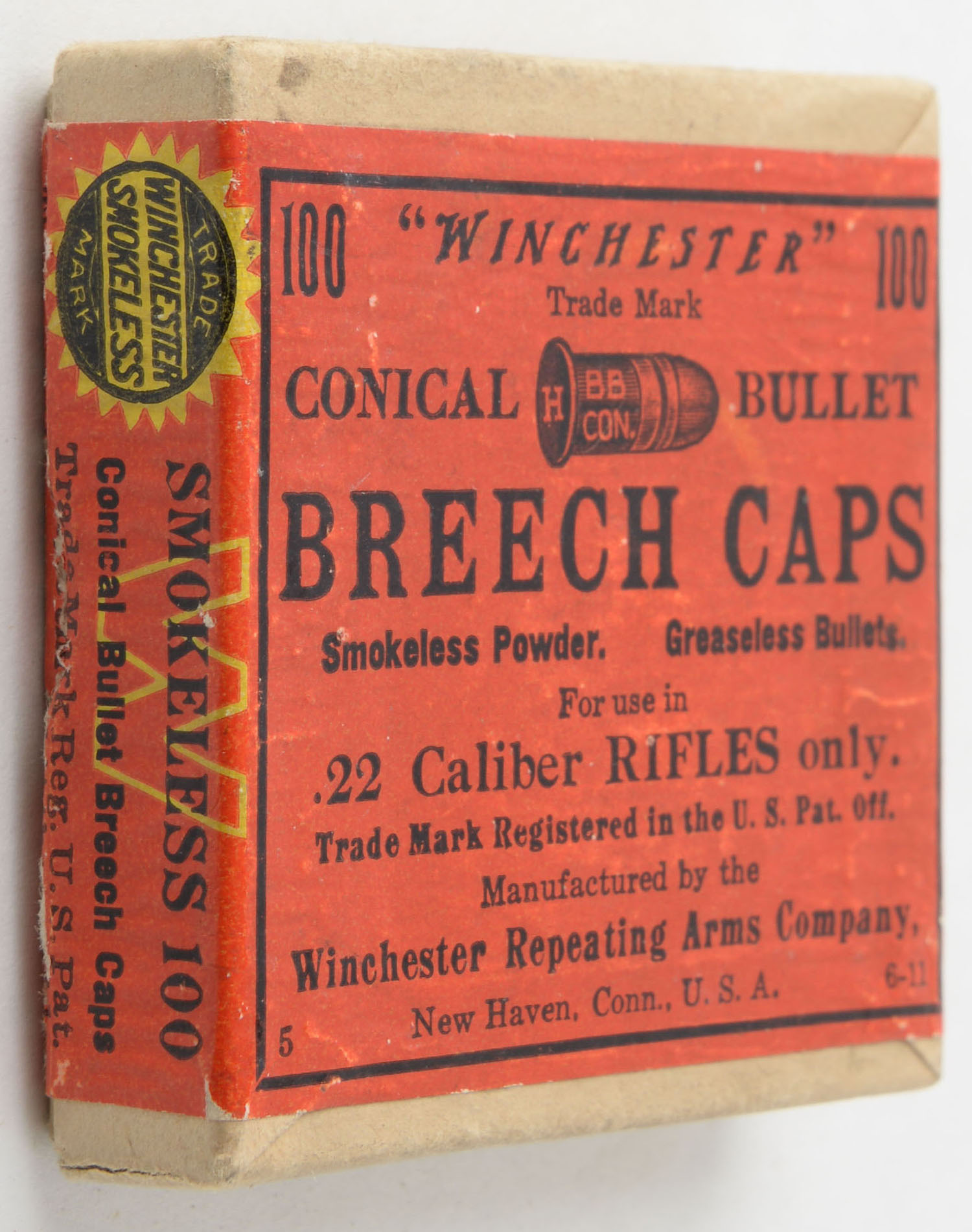 Winchester, Breech Caps, Conical Bullet, .22 Caliber, RR: WRA-29 CB-8, Full, 2pc. Buff box with red wraparound label, box is solid with excellent color, very minor shelf wear, corners are mostly sharp, edges are crisp, label is intact, ammo is excellent. Grade: Excellent + - Value: 250 to 375