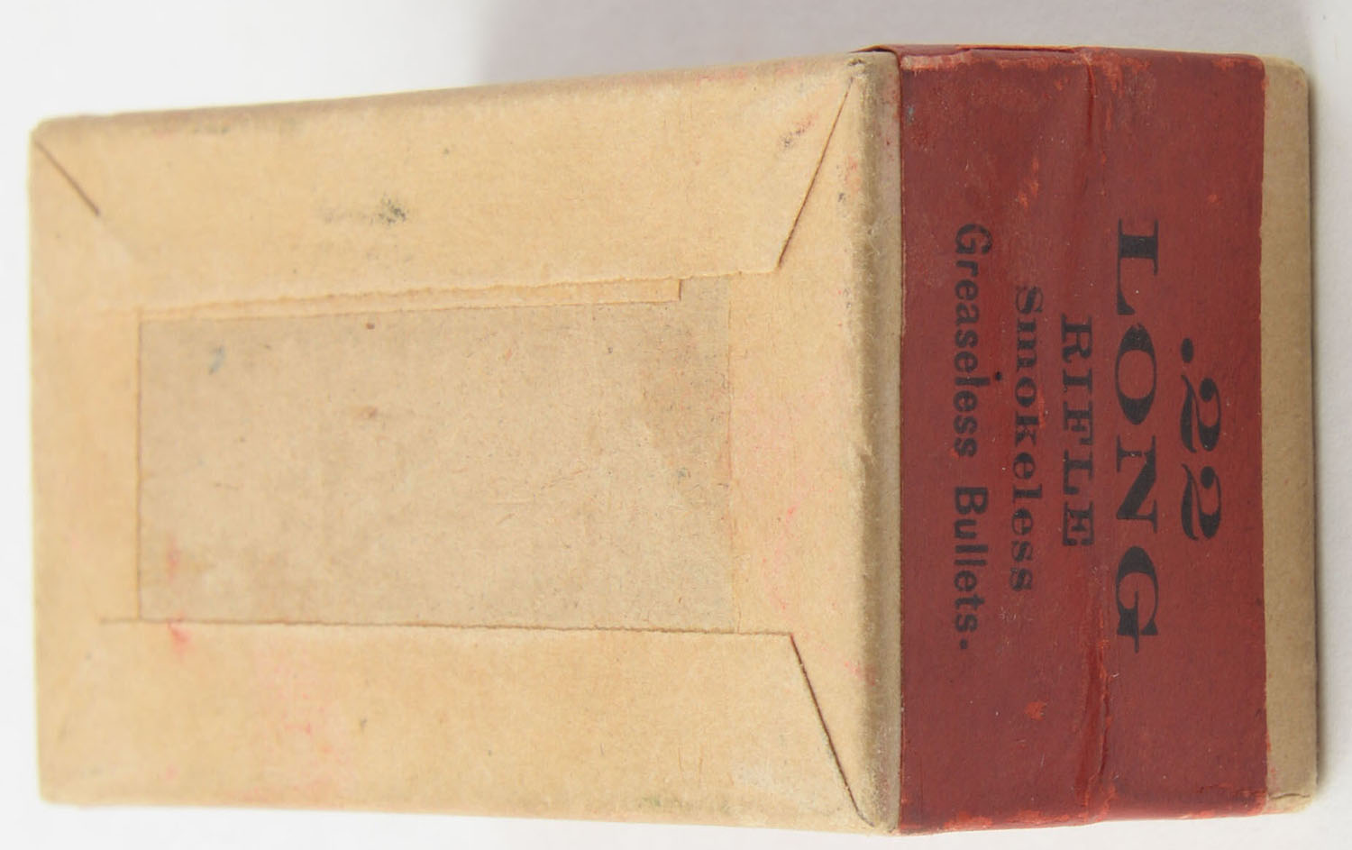 Winchester, Smokeless Cartridges, .22 Long Rifle, RR: WRA- 115 LR-12a, FULL & SEALED, 2pc. Buff box with red top & side sealing labels, box is solid with excellent color, very minor edge & corner wear, labels are intact. Grade: Excellent + - Value: 300 to 450