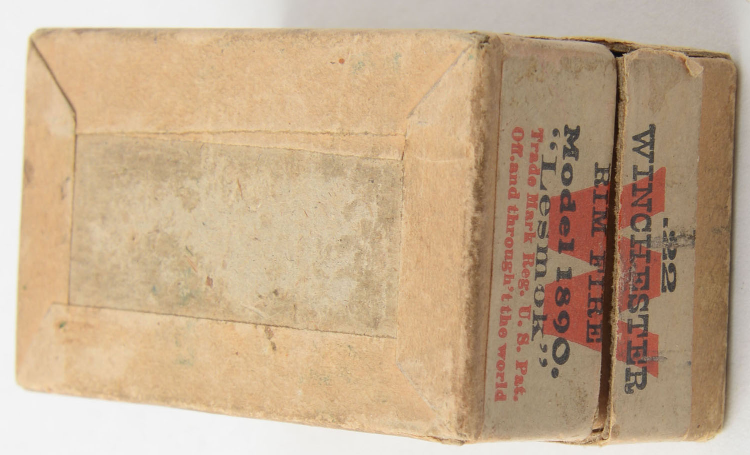 Winchester, .22 W.R.F. Cartridges, ''Lesmok'' Powder, RR: WRA-151 WRF-11, Full, 2pc. Buff box with gray top & side sealing labels, box is solid with good color, some age soiling & shelf wear, minor edge & corner wear, vertical seam splits to both front corners of lid, label is intact and sealed on front side, ammo is very good. Grade: Very Good - Value: 80 to 120