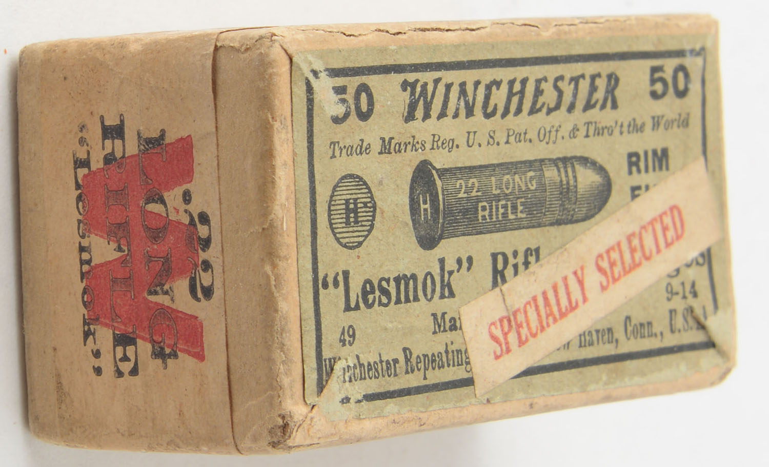 Winchester, ''Lesmok Rifle Cartridges, .22 Long Rifle, Specially Selected, RR: WRA 121 LR-26h, FULL & SEALED, 2pc. Buff box with green top & off-white side sealing labels, white ''Specially Selected'' over-label, box is solid with very good to excellent color, very minor age soiling, some edge & corner wear, labels are intact. Grade: Very Good ++ - Value: 300 to 450