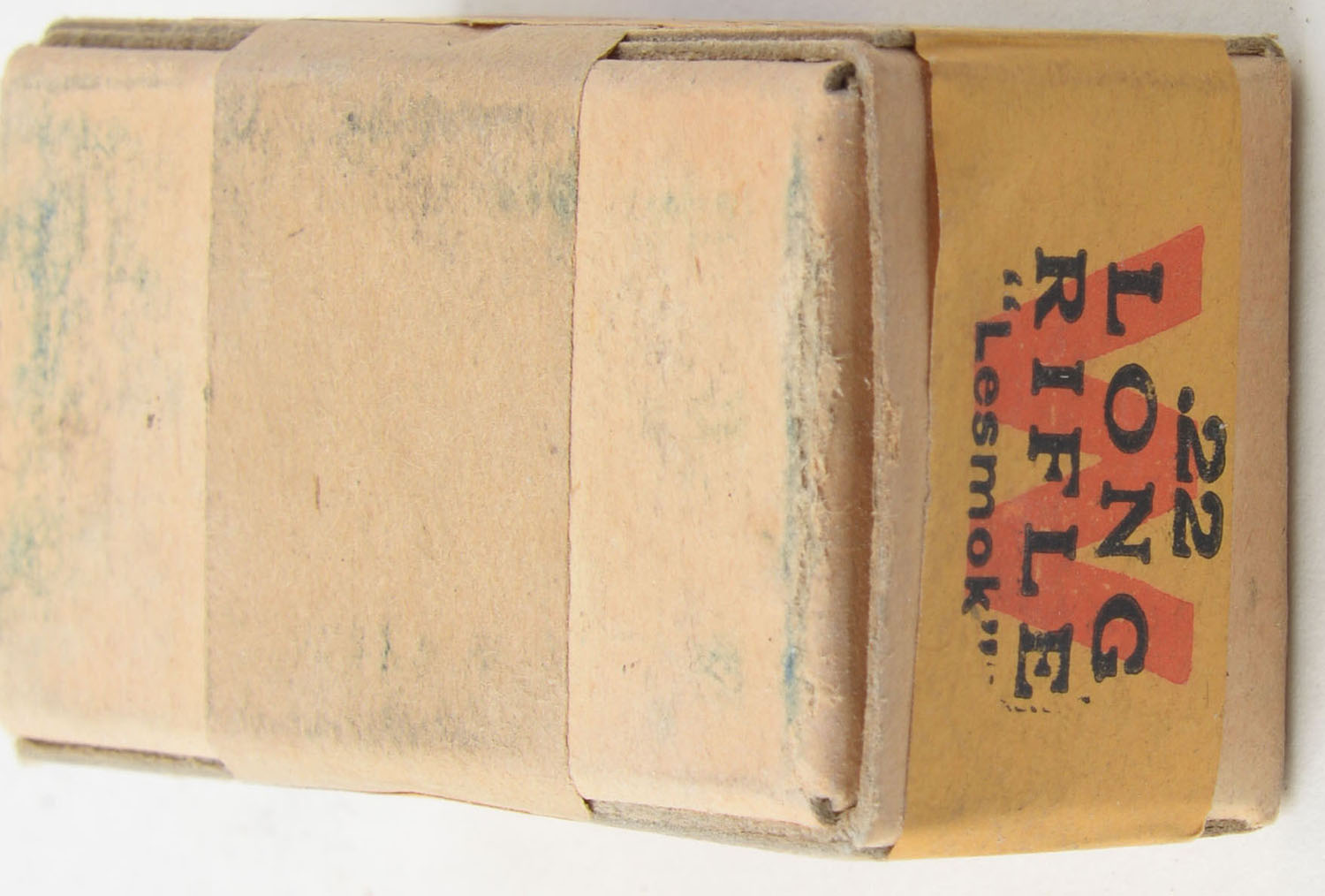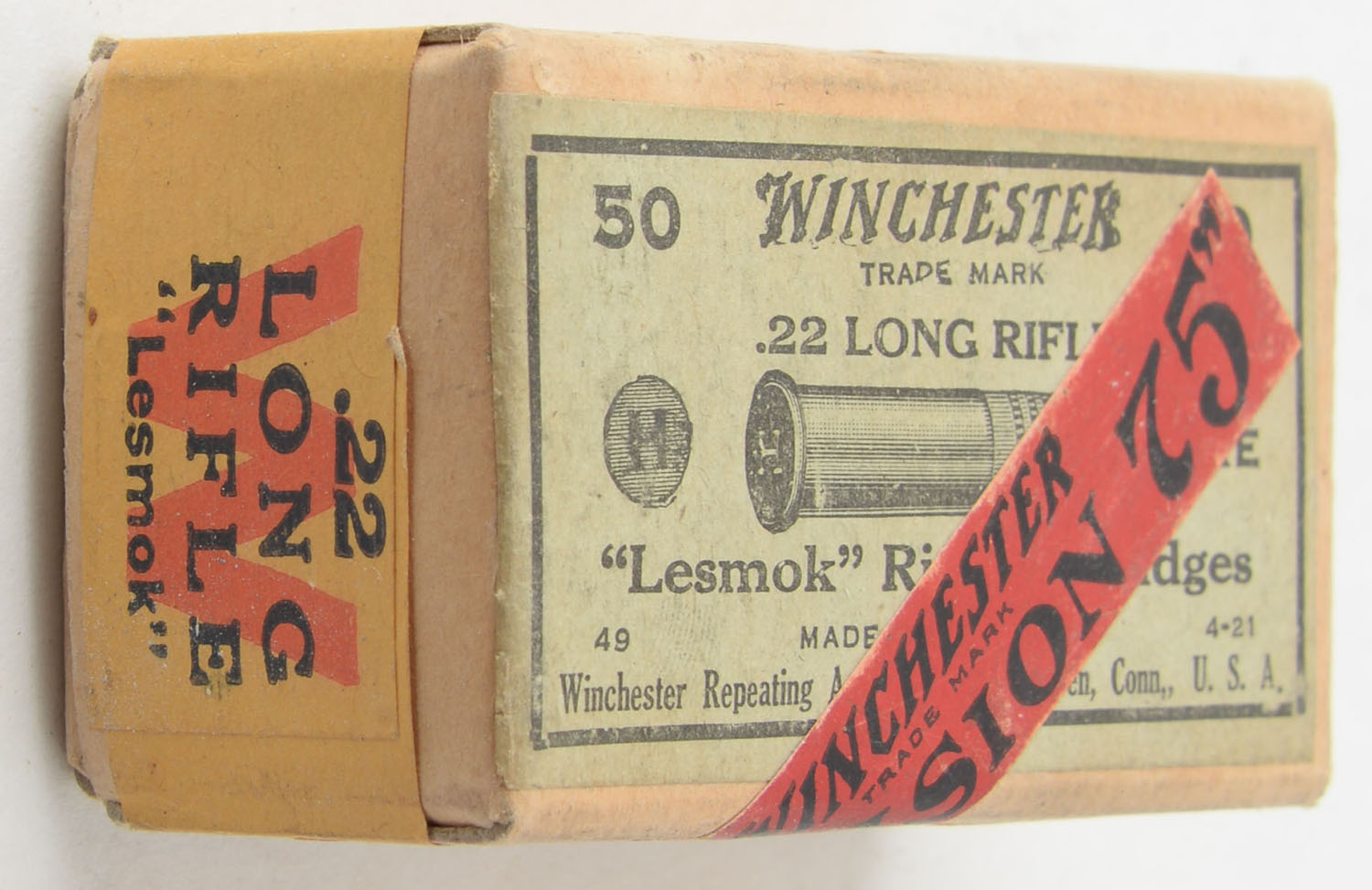 Winchester, ''Precision 75'', .22 Long Rifle, ''Lesmok'', RR: WRA-129 LR-39b, FULL & SEALED, 2pc. Buff box with green top & yellow side sealing labels, red ''Precision 75'' over-label, box is solid with excellent color, very minor color fading, corners are mostly sharp, edges are crisp, labels are intact. Grade: Excellent - Value: 120 to 180