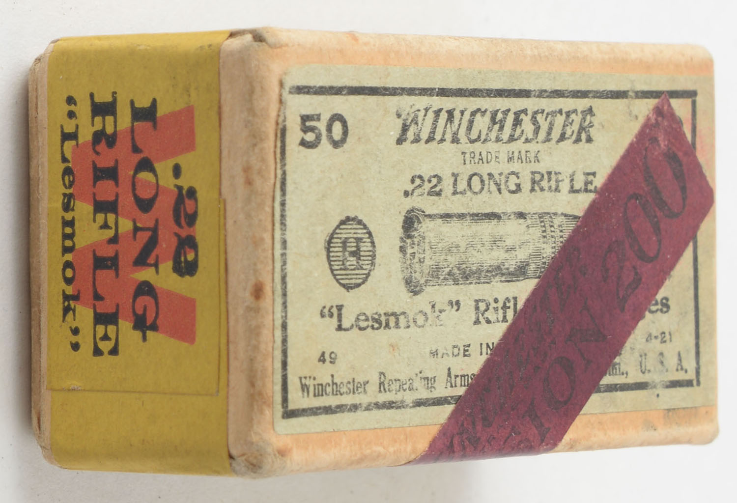 Winchester, ''Precision 200'', .22 Long Rifle, ''Lesmok'', RR: WRA-129 LR-40b, Full, 2pc. Buff box with green top & yellow side sealing labels, dark red ''Precision 200'' over-label, box is solid with very good color, some shelf wear, minor edge & corner wear, labels are intact, ammo is good. Grade: Very Good ++ - Value: 50 to 75