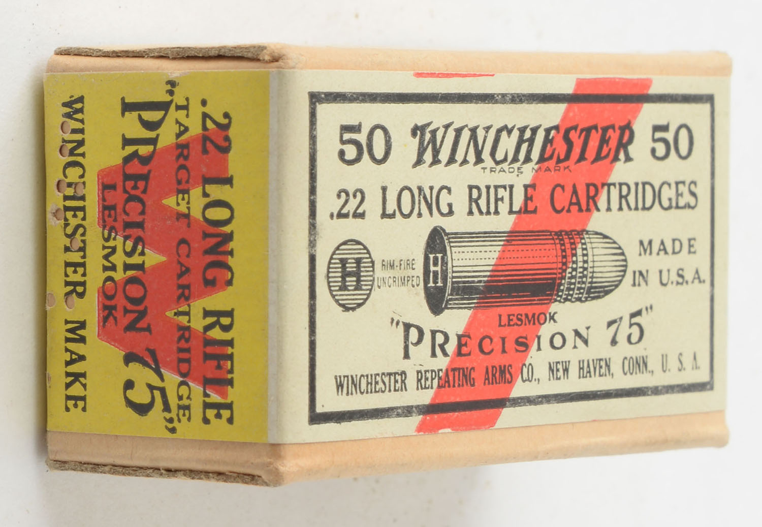 Winchester, ''Precision 75'', .22 Long Rifle, Lesmok, RR: WRA-129 LR-41, FULL & SEALED, 2pc. Buff box with gray yellow & red wraparound label, box is MINT with minty color, corners are sharp, edges are crisp, label is intact. Grade: MINT - Value: 100 to 150