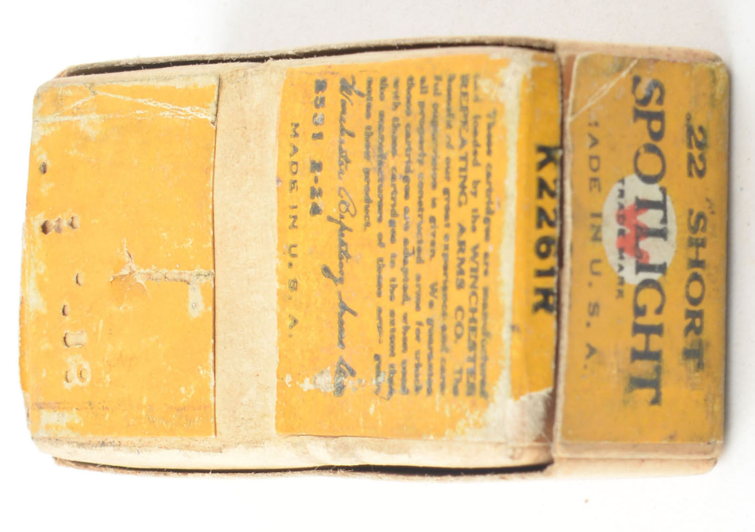 Winchester, Lestayn Spotlight, .22 Short, Lesmok, RR: WRA-81 SS-9, Full, 2pc. Buff box with green & yellow wraparound label, red ''Lestayn'' over-stamp, box is solid with very good color, some age soiling & shelf wear, minor edge & corner wear, label is intact, ammo is very good. Grade: Very Good + - Value: 200 to 300