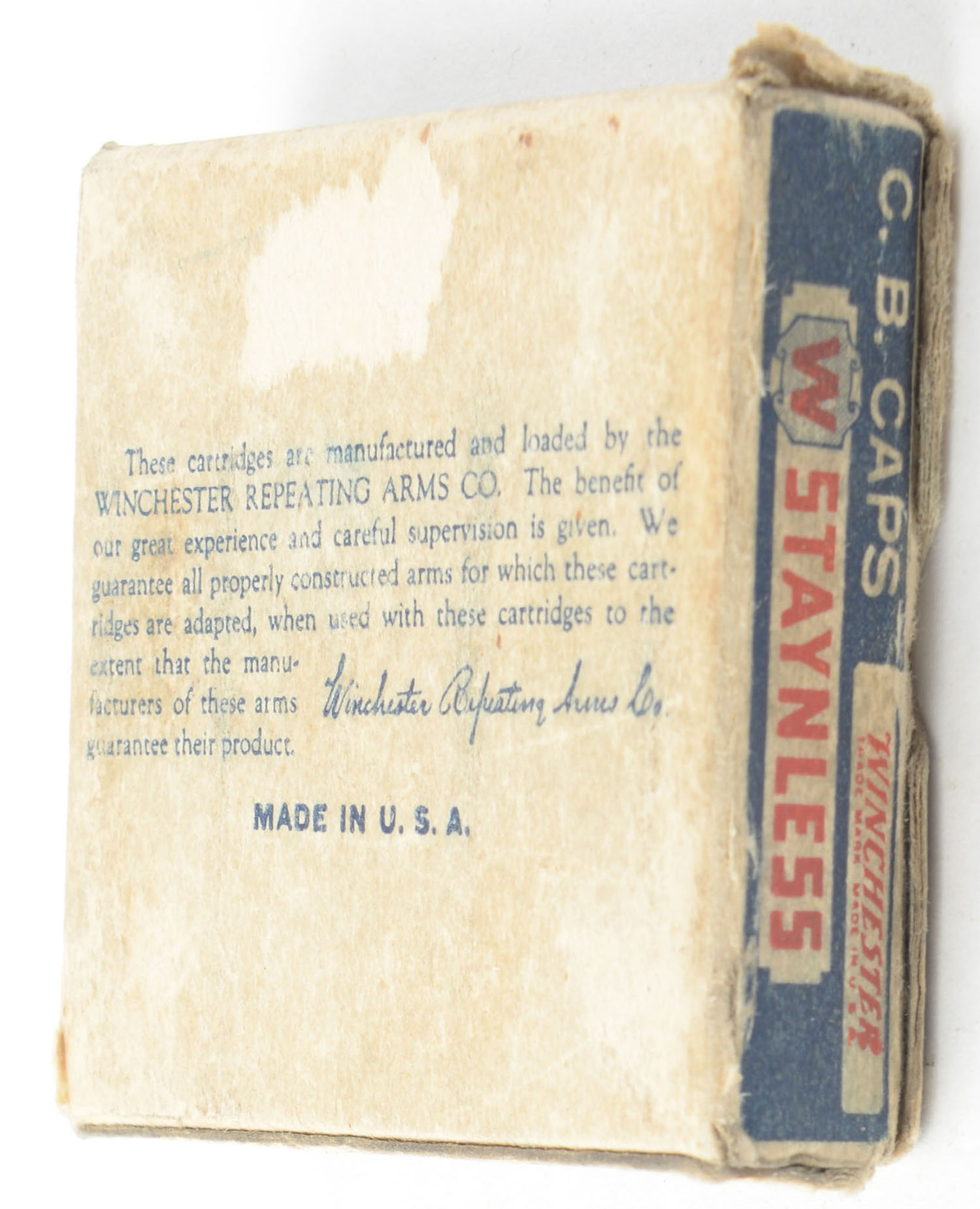 Winchester, Staynless, C.B. Caps, Conical Bullet, Not in RHWeb, but is where WRA-12B CB-3 should be (bottom pictured only, but not numbered), Partial approx 85rds. 1pc. Blue white & red box, box is solid with good color, age soiling, crease across top, corner wear, some shelf & edge wear, end flaps are solid, ammo is very good. Grade: Good - Value: 100 to 150