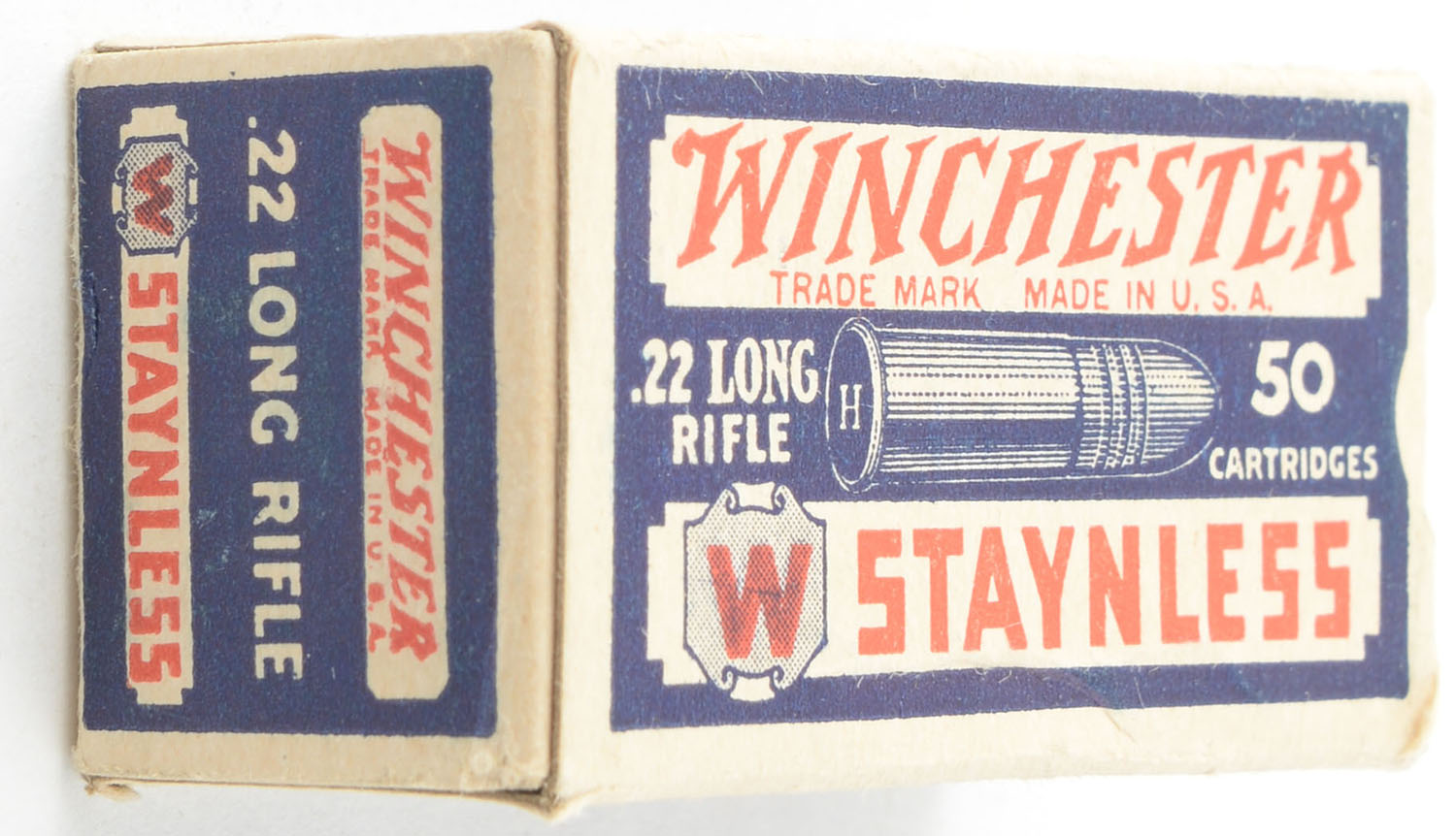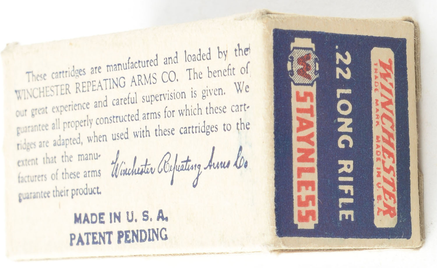 Winchester, Staynless, .22 Long Rifle, Army Lot 67, RHWeb: WRA-12B LR-1C, Full, 1pc. Blue white & red box, box is solid with excellent color, very minor corner wear, edges are crisp, end flaps are solid, ammo is very good. Grade: Excellent ++ - Value: 120 to 180