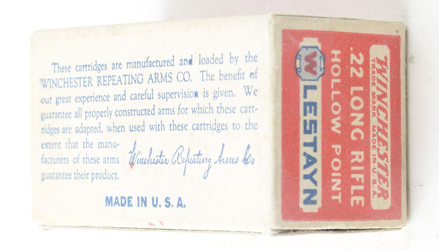 Winchester, Lestayn, .22 Long Rifle Hollow Point, RHWeb: WRA-13.5 LR-2a, Full, 1pc. Red white & blue box, box is solid with excellent color, very minor color fading & corner wear, edges are crisp, end flaps are solid, ammo is good. Grade: Excellent ++ - Value: 250 to 375