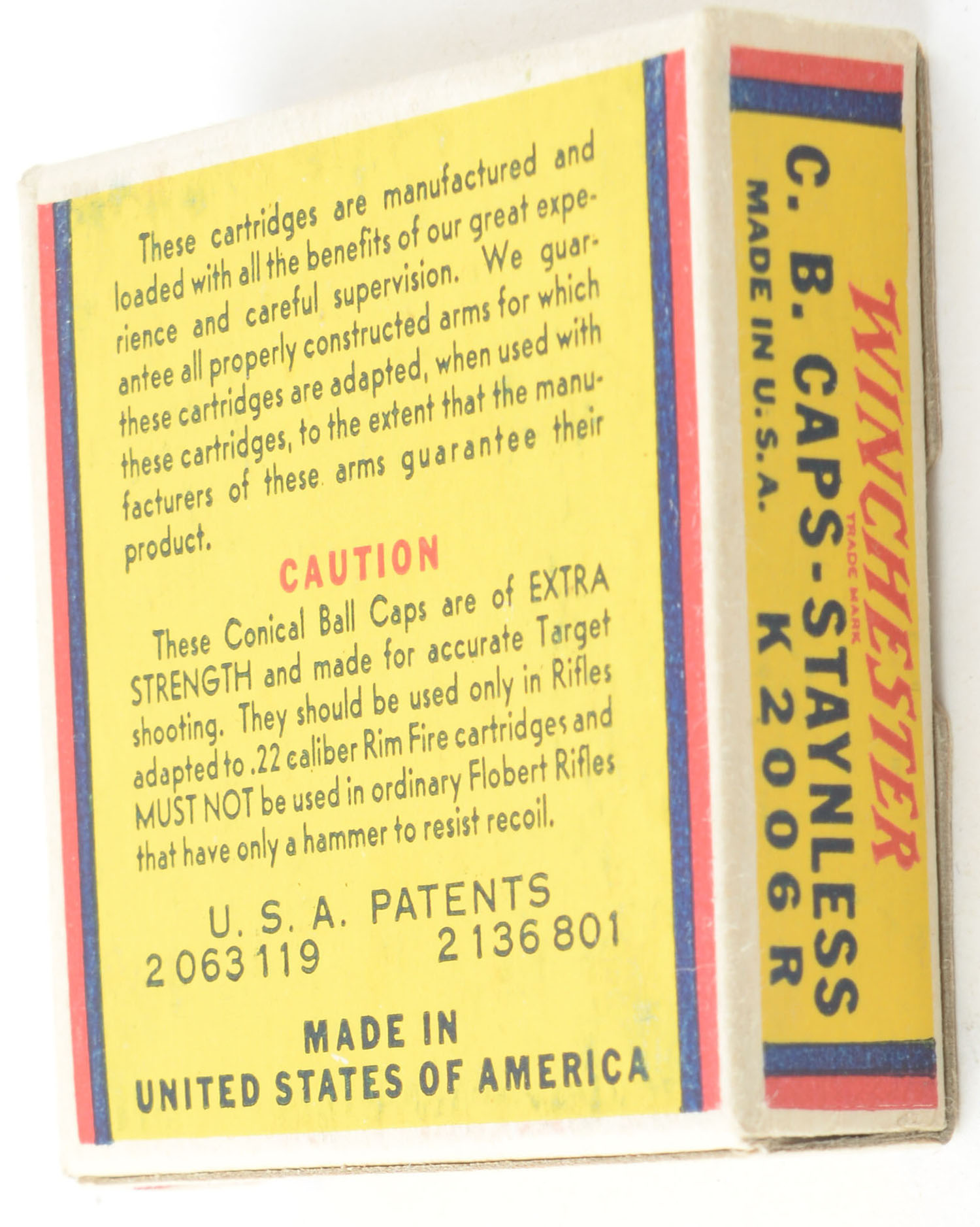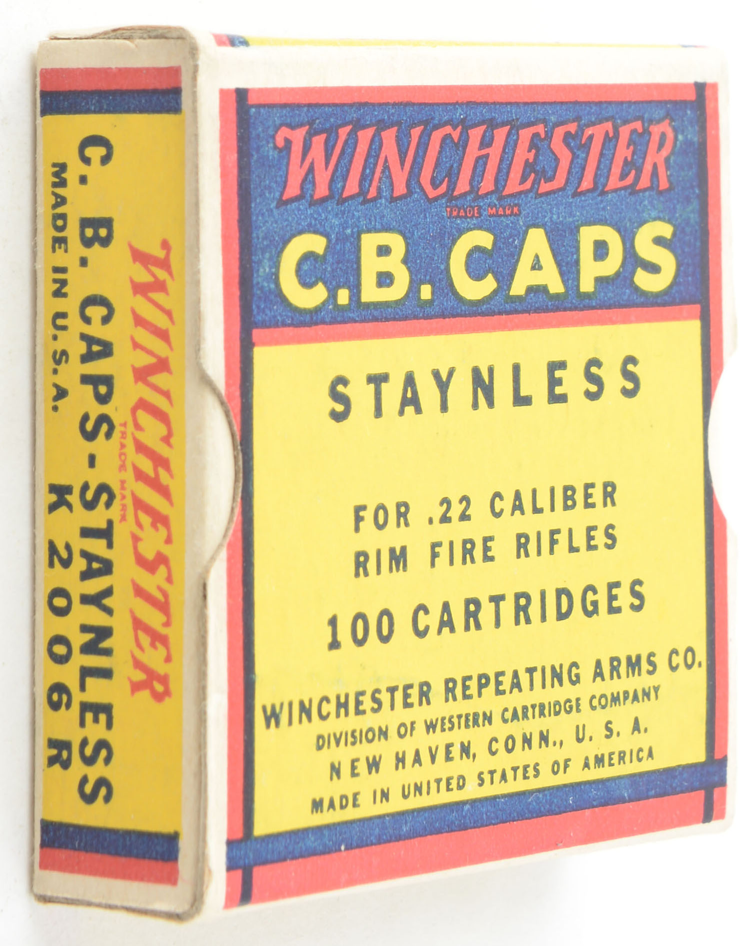 Winchester, Staynless, C.B. Caps, RHWeb: WRA-15 CB-1, Full, 1pc. Yellow blue & red box, box is near mint with minty color, only very minor corner wear, edges are crisp, end flaps are solid, ammo is excellent. Grade: Excellent ++ - Value: 80 to 120