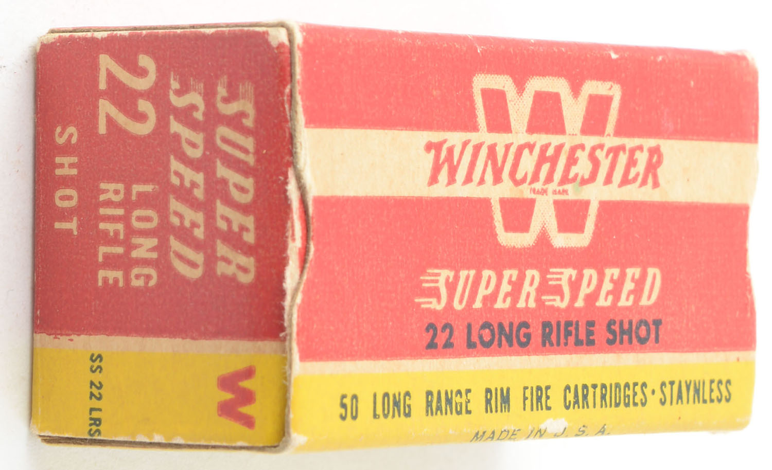 Winchester, Super Speed, .22 Long Rifle Shot, RHWeb: WRA-17 LR-5d, Partial 41rds., 1pc. Red yellow & white box, box is solid with excellent color, very minor age soiling, minor edge & corner wear, end flaps are solid, ammo is excellent. Grade: Very Good ++ - Value: 10 to 15