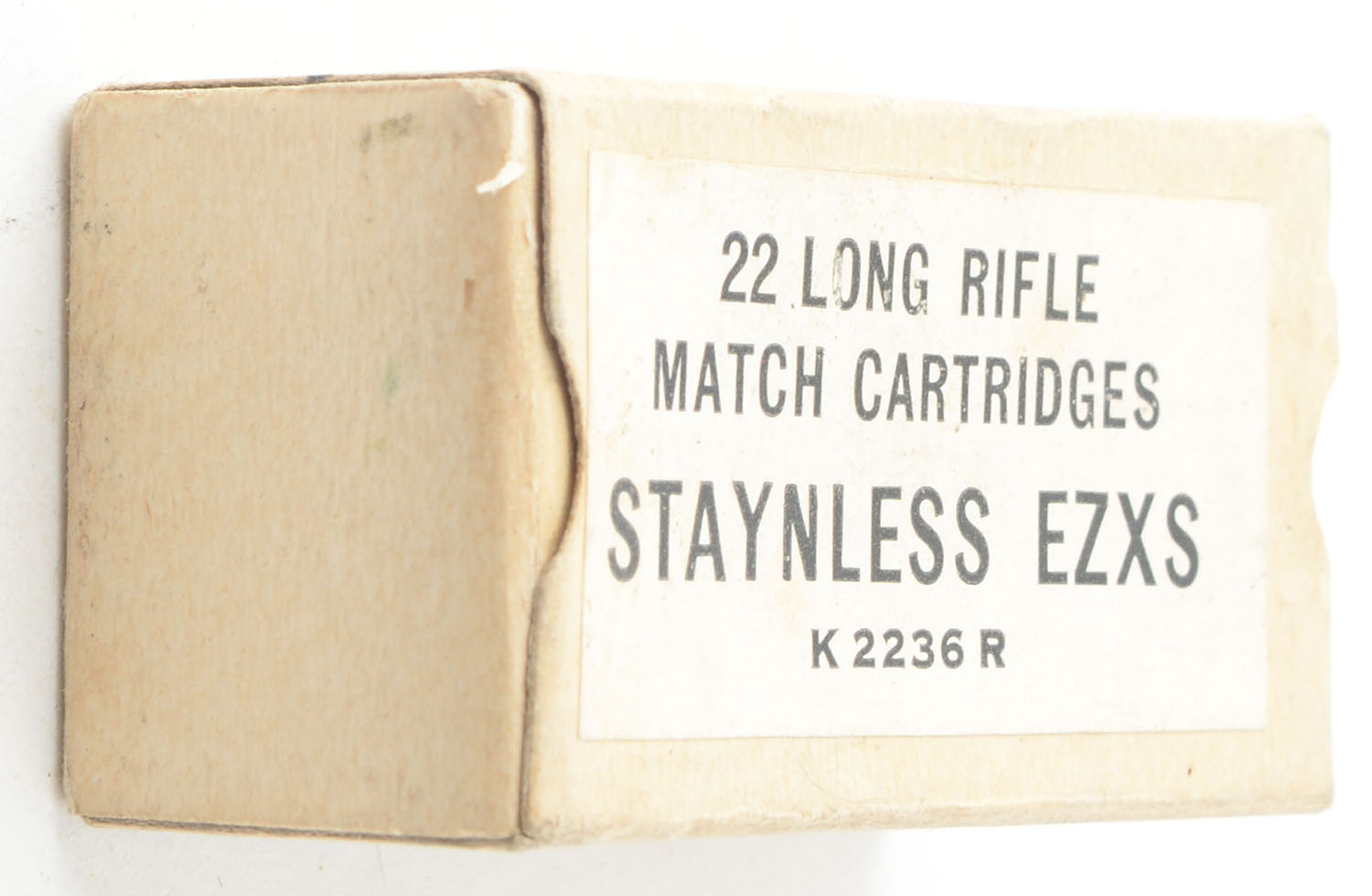 Winchester, Staynless EZXS, .22 Long Rifle, Match Cartridges, RHWeb: WRA-54 LR-4, Full, 1pc. Buff box with white label & black printing, box is solid with excellent color, very minor age soiling & edge wear, minor corner wear, end flaps are solid, ammo is excellent. Grade: Excellent - Value: 400 to 600