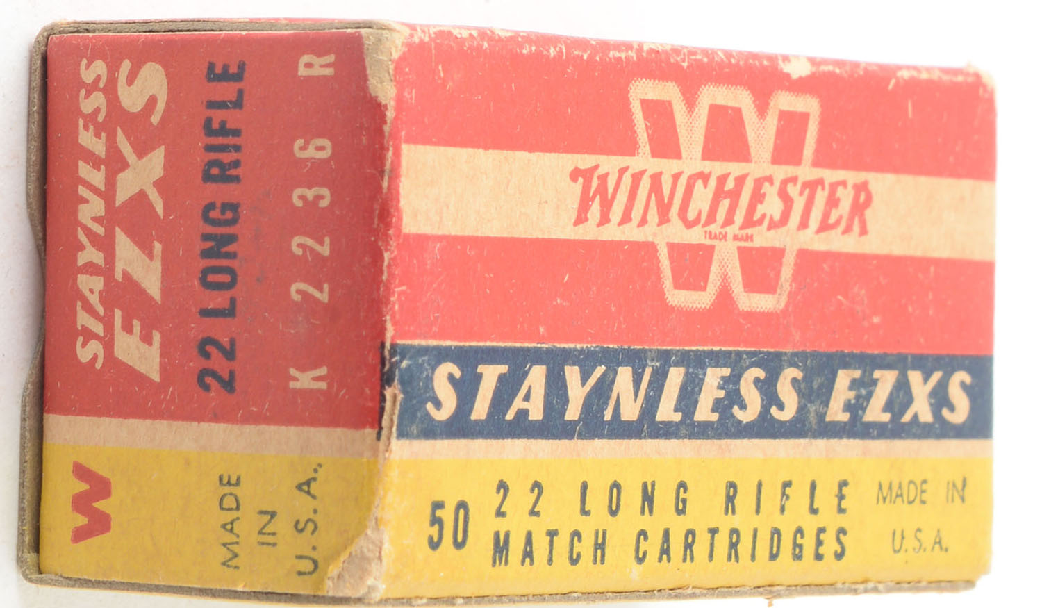 Winchester, Staynless EZXS, .22 Long Rifle, Match Cartridges, RHWeb: WRA-54 LR-6, Full, 1pc. Red yellow & blue box, box is solid with very good color, minor age soiling, very minor shelf & corner wear, end flaps are solid, ammo is good to very good. Grade: Very Good ++ - Value: 24 to 36