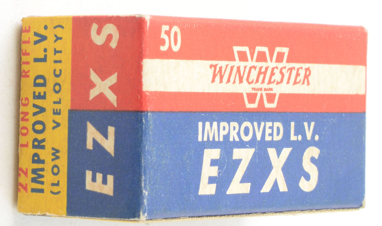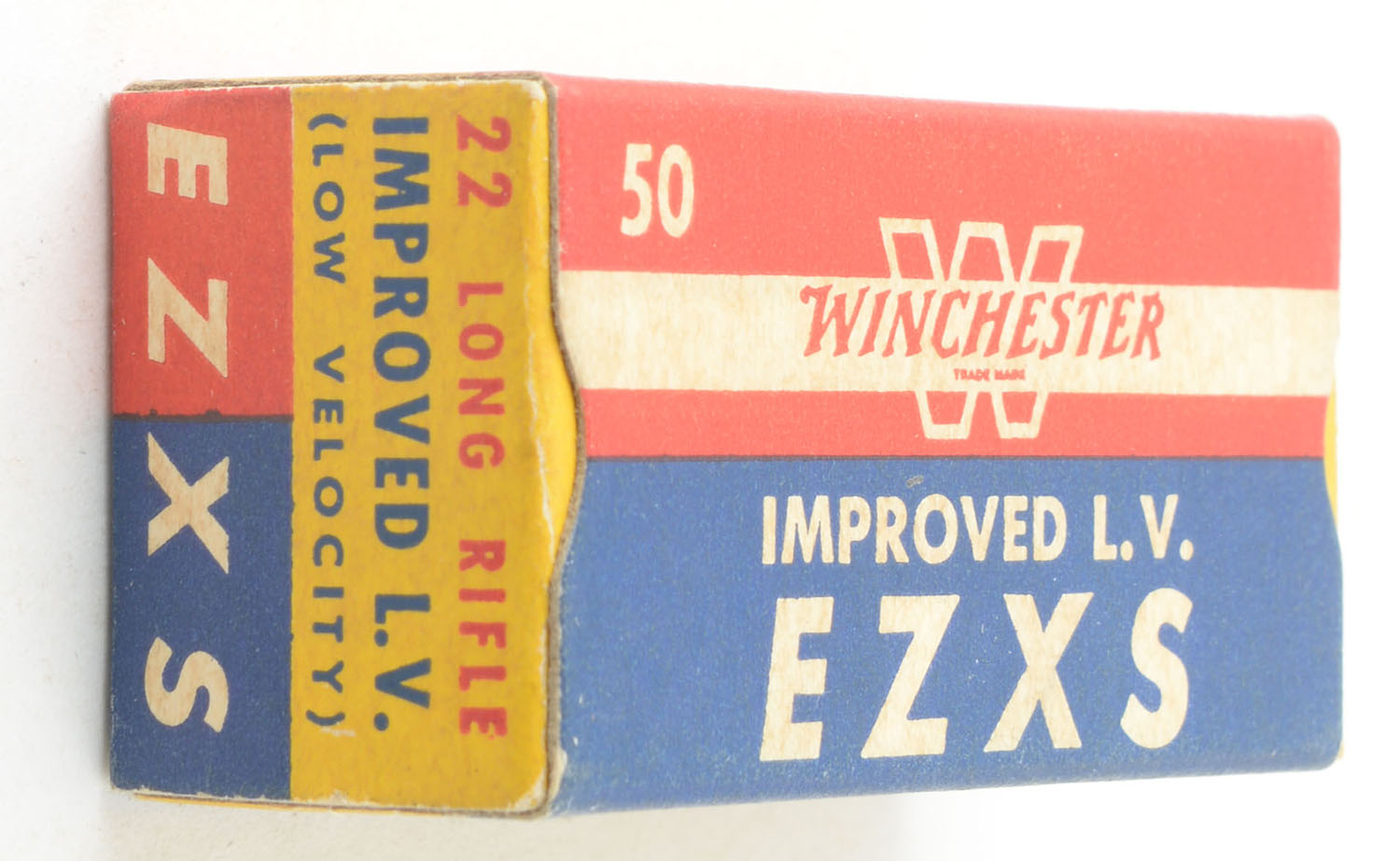Winchester, Improved L.V. EZXS, .22 Long Rifle, Match Cartridges, RHWeb: WRA-54 LR-8b, Partial 16rds., 1pc. Blue red & yellow box, box is solid with excellent color, very minor age soiling & corner wear, edges are crisp, end flaps are solid, ammo is excellent. Grade: Excellent + - Value: 20 to 30