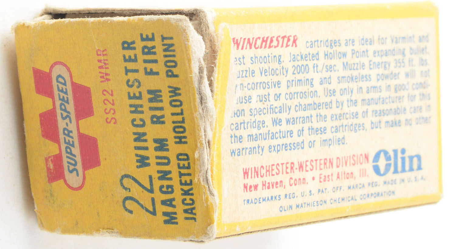 Winchester, Super-Speed, .22 Winchester Magnum, 40 Grain Jacketed Hollow Point, RHWeb: WRA-19 WMR-1.5, Partial 38rds., 1pc. Yellow white & red box, right end flap is torn, very good color, minor age soiling, stain on top, minor corner wear, edges are mostly crisp, left end flap is solid, ammo is good to very good. Grade: Good - Value: 8 to 12