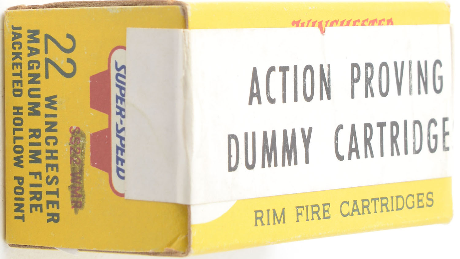 Winchester, Super-Speed, .22 Winchester Magnum, Action Proving Dummy Cartridges, RHWeb: WRA-20 WMR-3, FULL & SEALED, 1pc. Yellow white & red box, box is solid with excellent color, very minor age soiling, left end has been written on, corners are sharp, edges are crisp, end flaps are solid. Grade: Excellent ++ - Value: 20 to 30