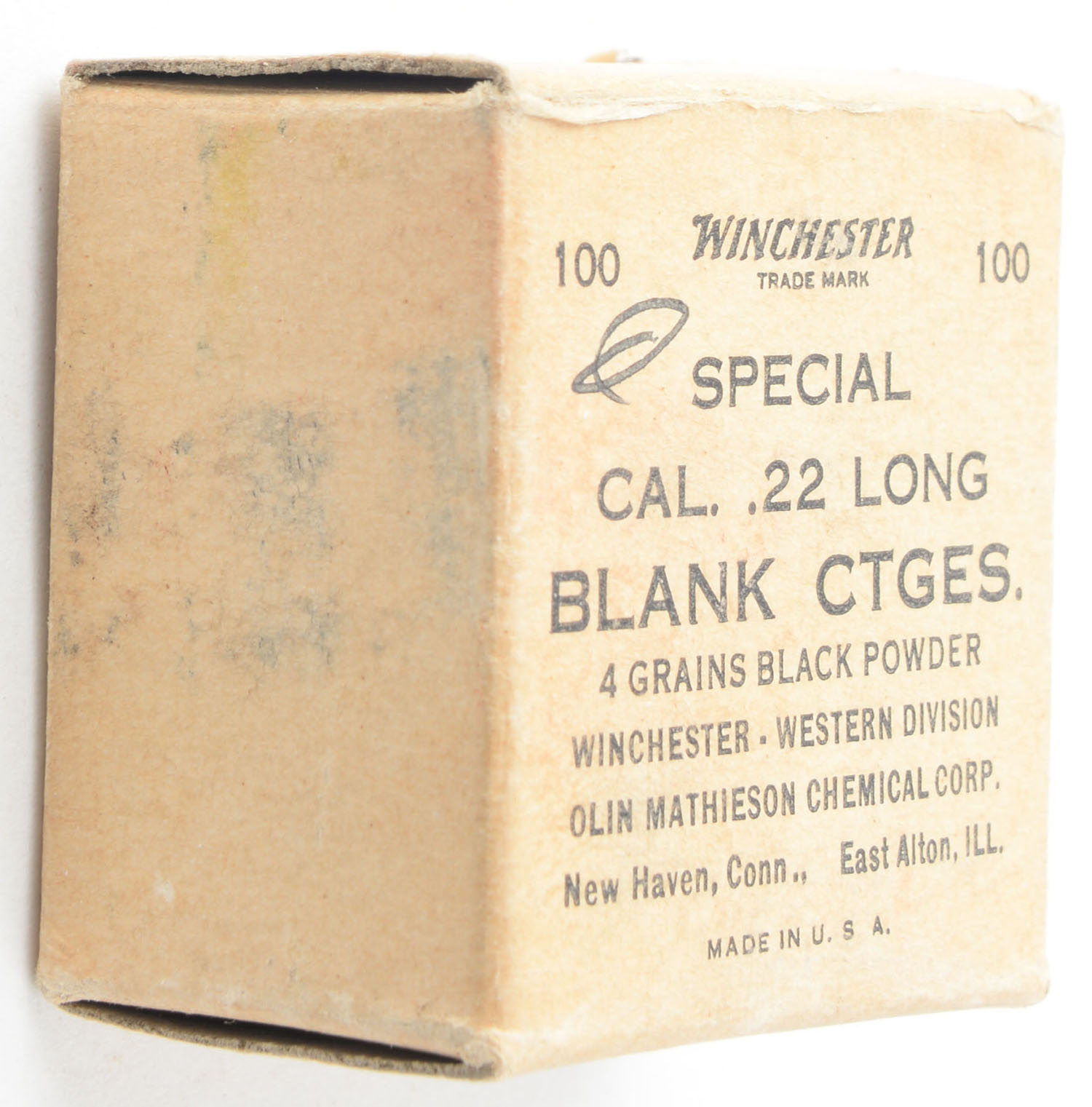 Winchester, Special, .22 Long Blank, 4 Grains Black Powder, RHWeb: WRA-99 L-2, Partial approx 2/3 full, 1pc. Buff box with black printing, box is solid with excellent color, some edge & corner wear, front has been written on, end flaps are solid, ammo is good. Grade: Very Good ++ - Value: 30 to 45