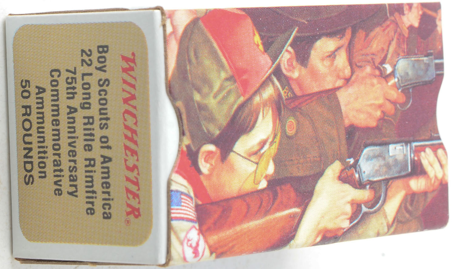 Winchester, Boy Scouts of America 75th Anniversary, .22 Long Rifle, RHWeb: WRA-70 LR-1, Full, 1pc. Multicolored box, box is MINT with minty color, sharp corners, crisp edges, rigid end flaps, ammo is minty. Grade: MINT - Value: 20 to 30