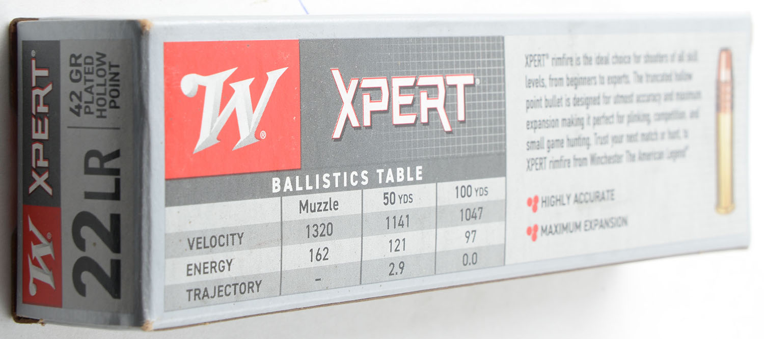Winchester, Xpert, .22 Long Rifle, 42 Grain Copper Plated Hollow Point, 1320 FPS, Full, 100rds., 1pc. Gray red & white box, box is MINT with minty color, corners are sharp, edges are crisp, end flaps are solid, ammo is mint. Grade: MINT - Value: 10 to 15